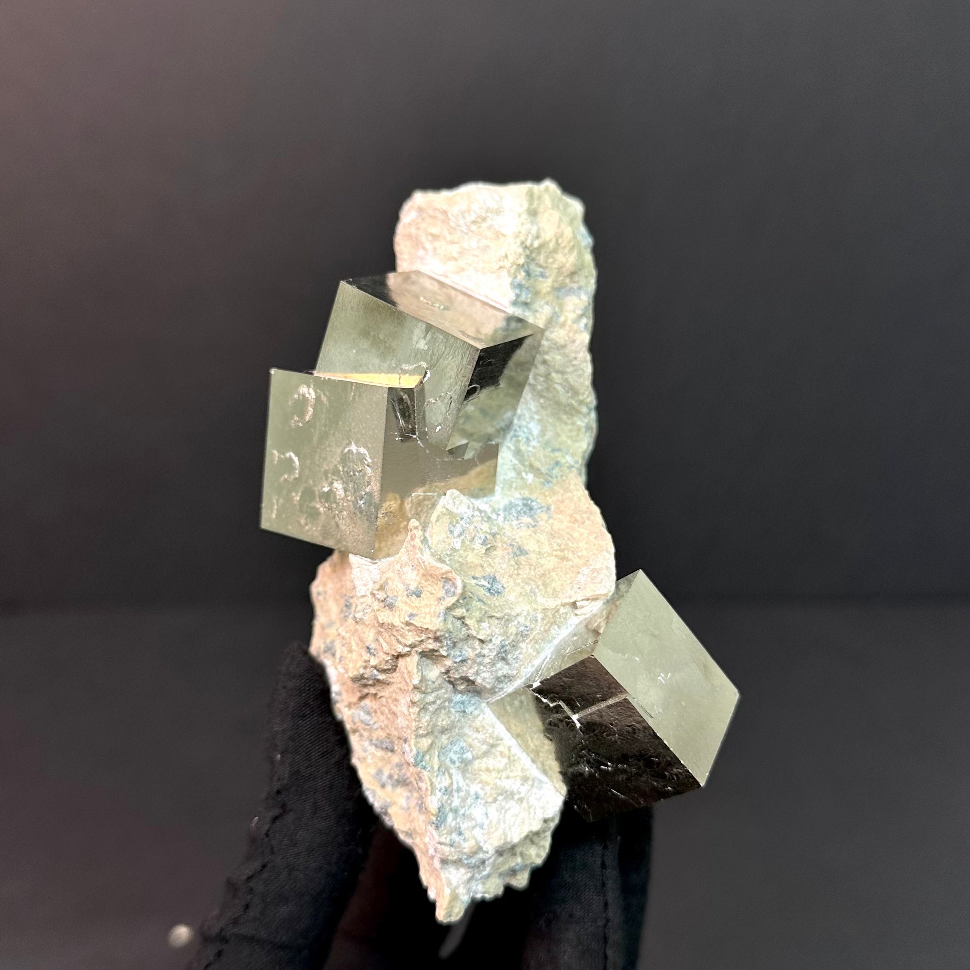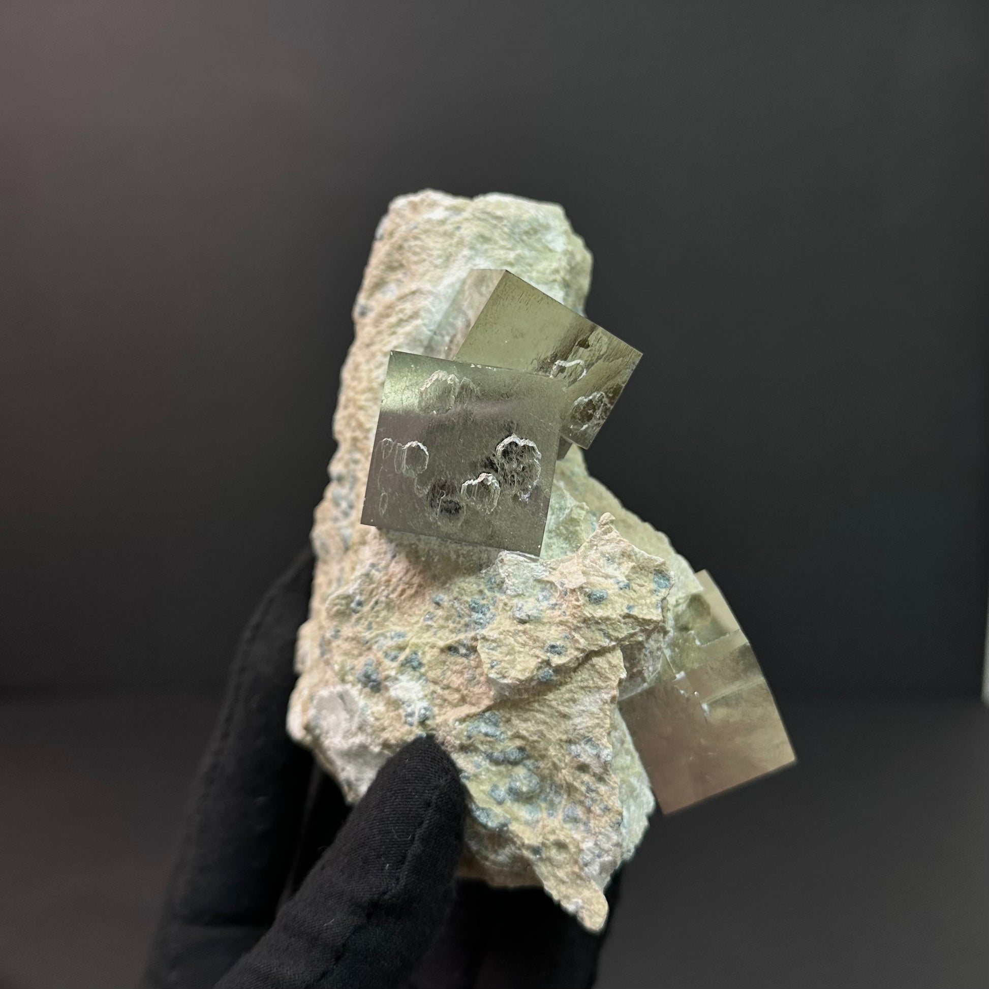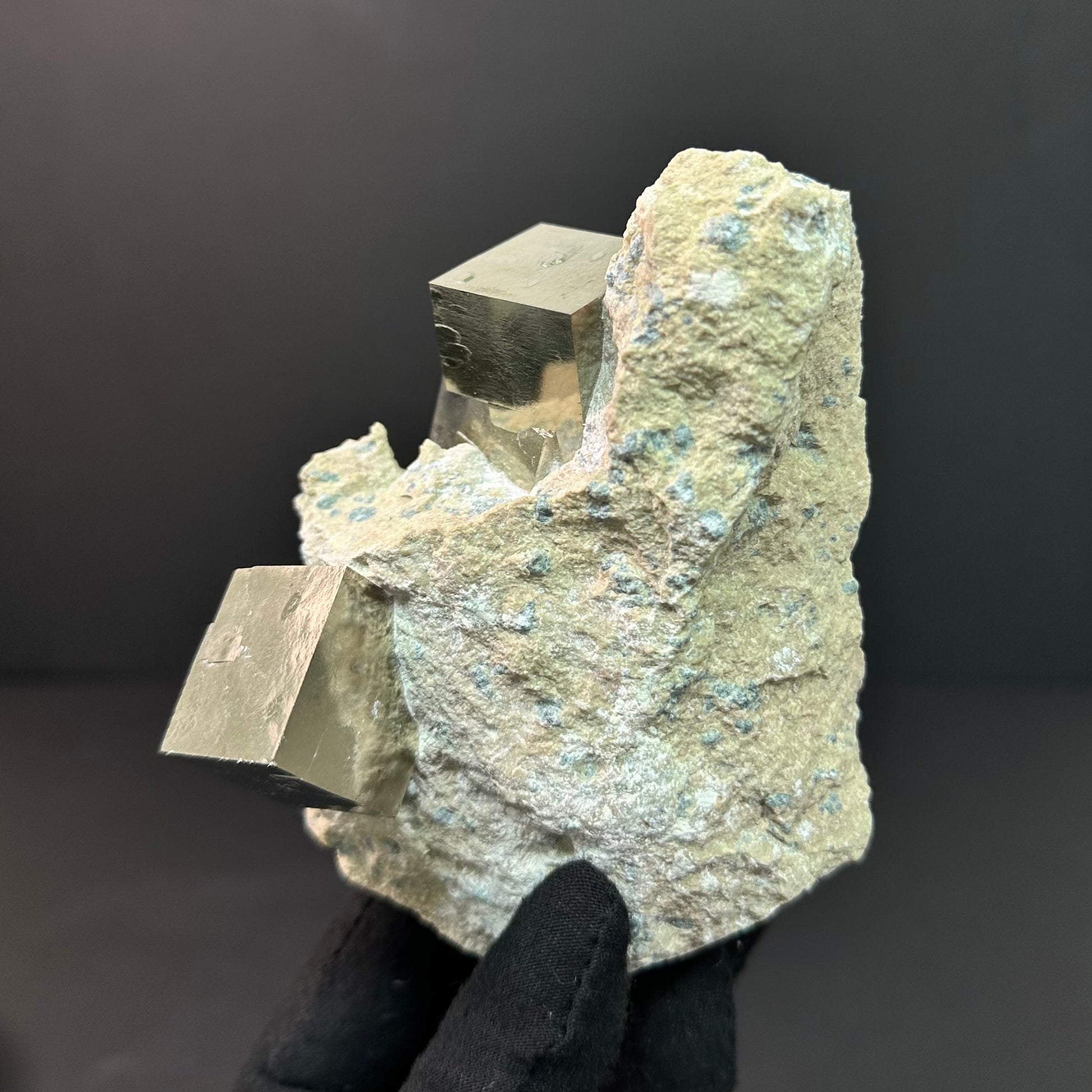 Display of Limestone Matrix with 2 intergrown and a Single Cube Pyrite cubes is a real treasure.