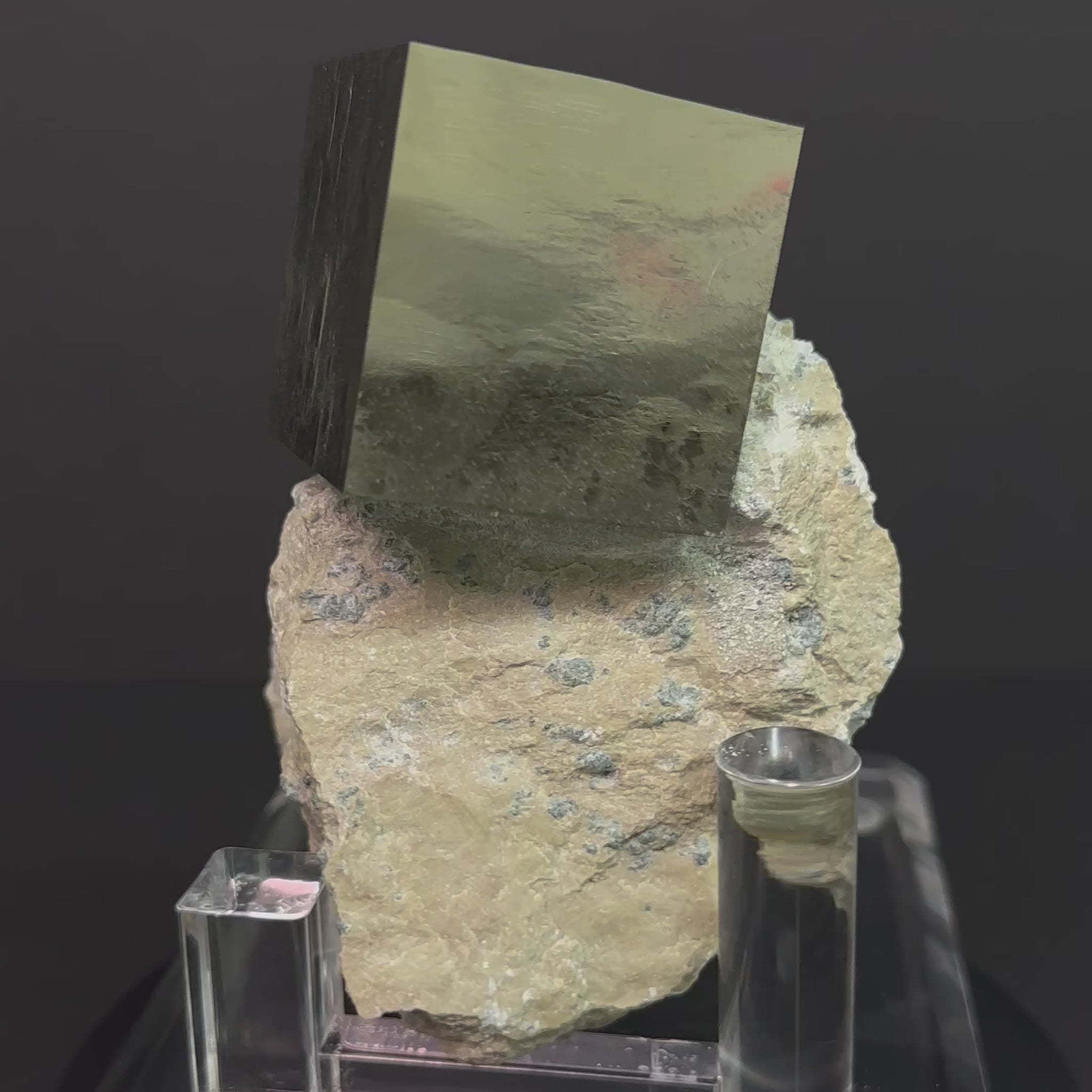 The perfect golden cubes nestled in the matrix are completely unique and captivating.