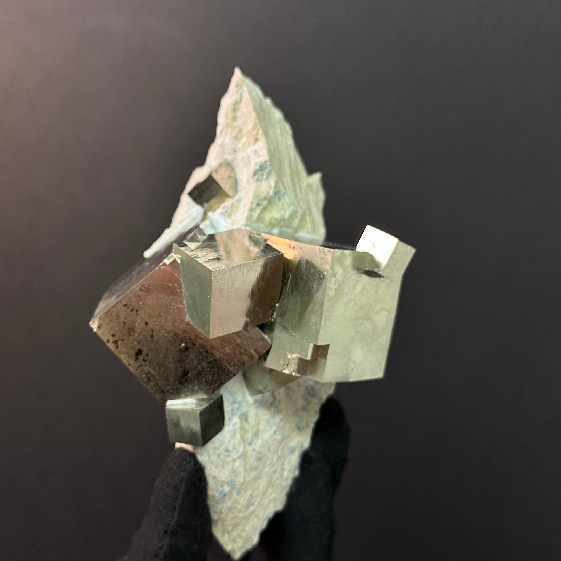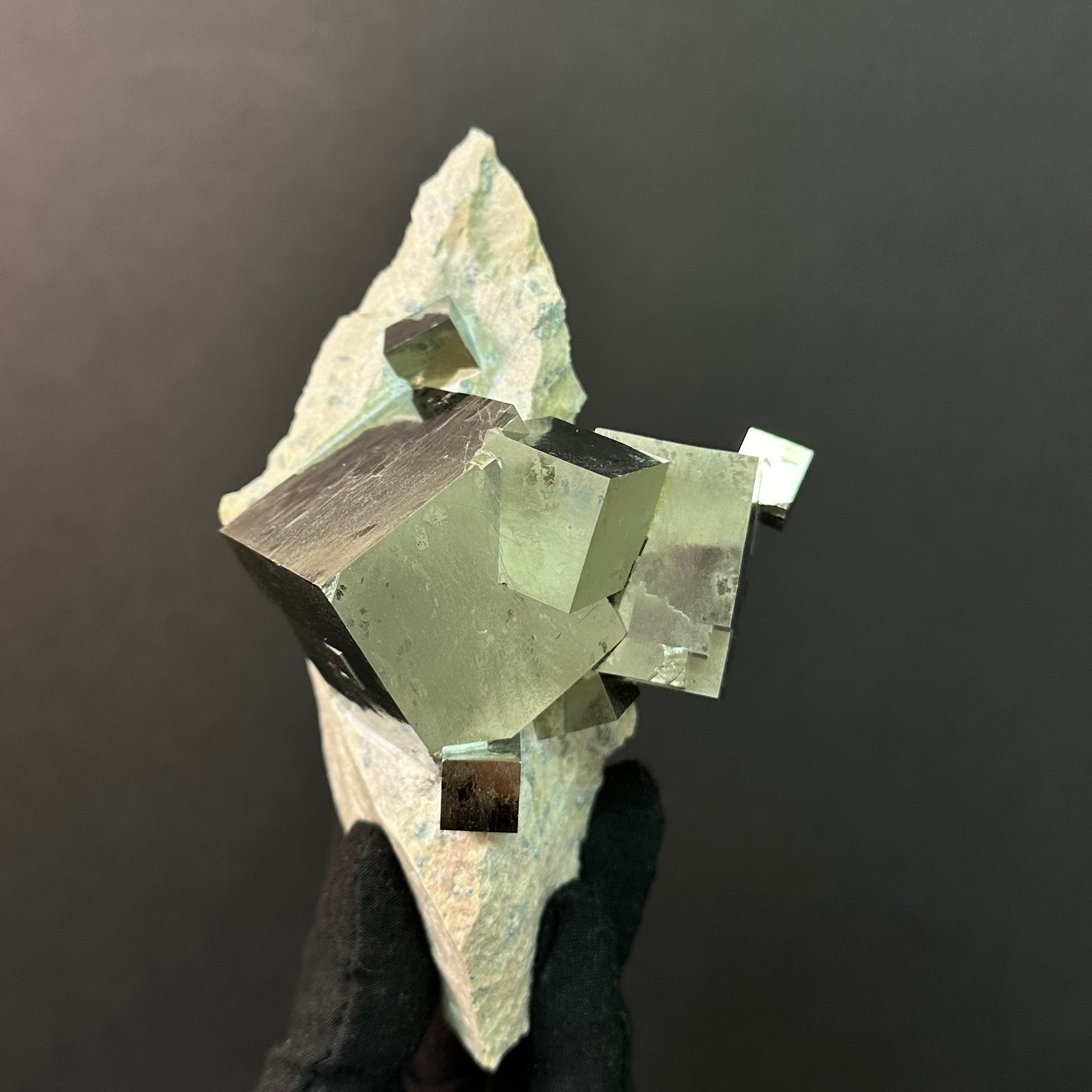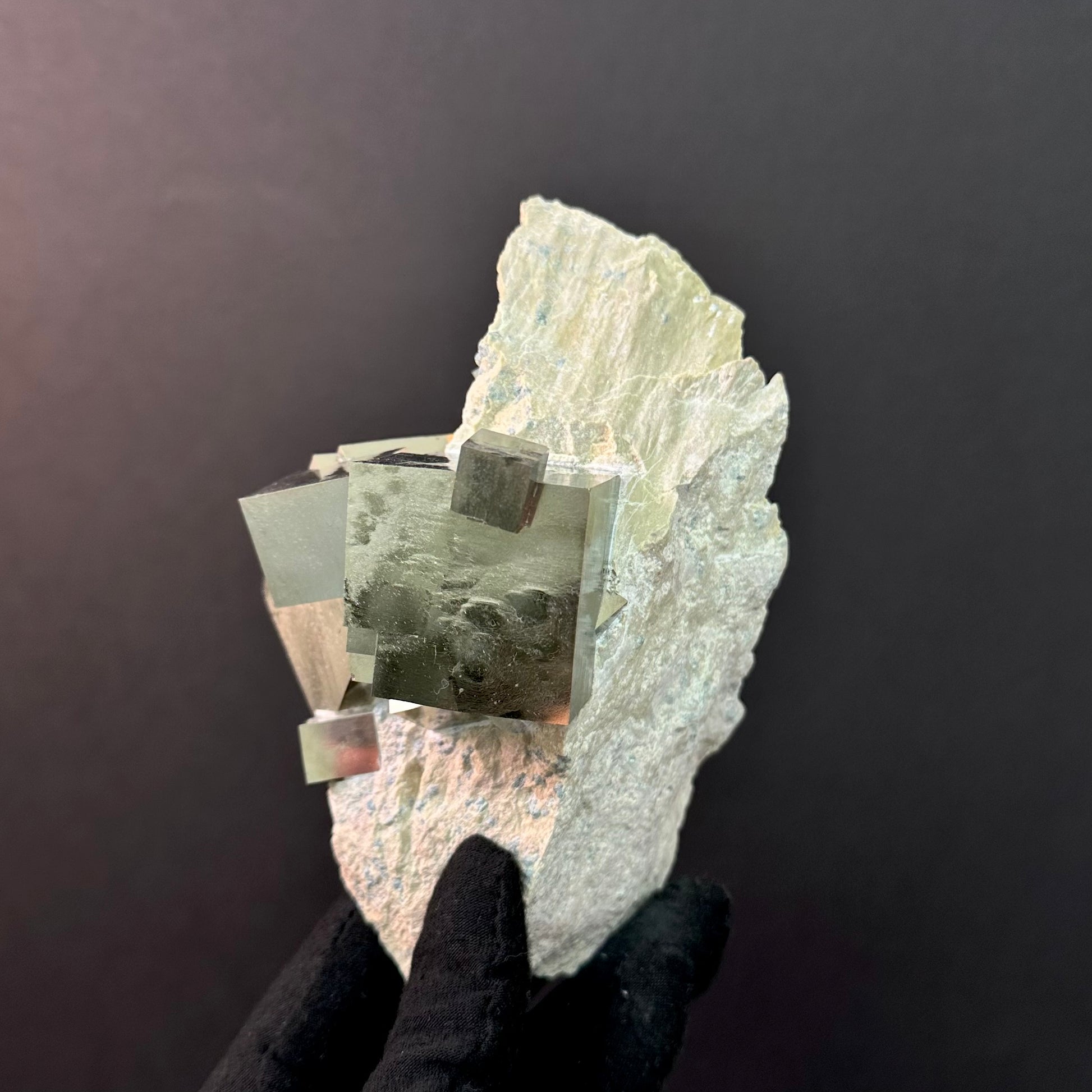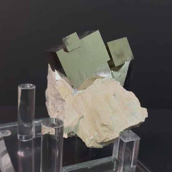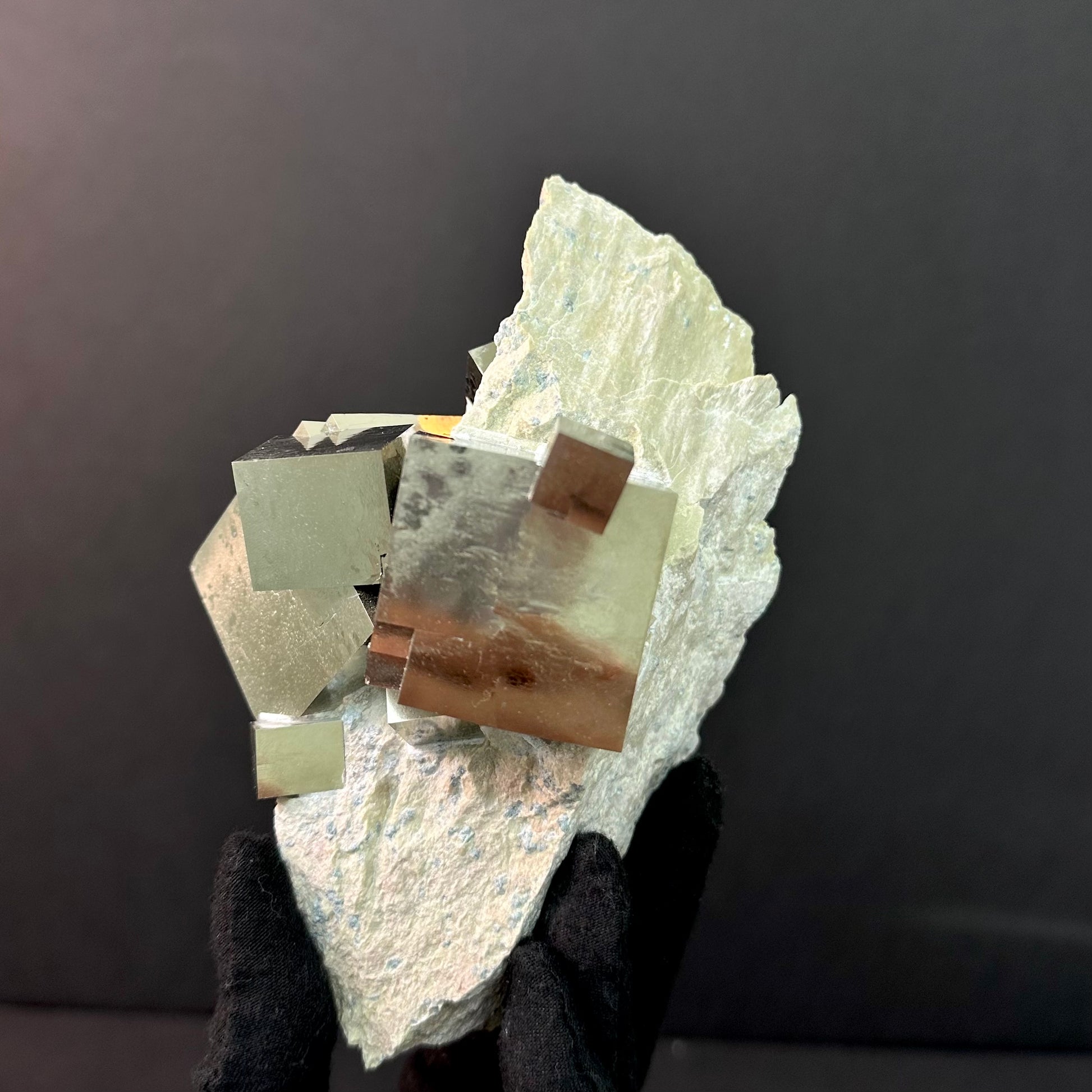 The perfect golden cubes nestled in the matrix are completely unique and captivating.