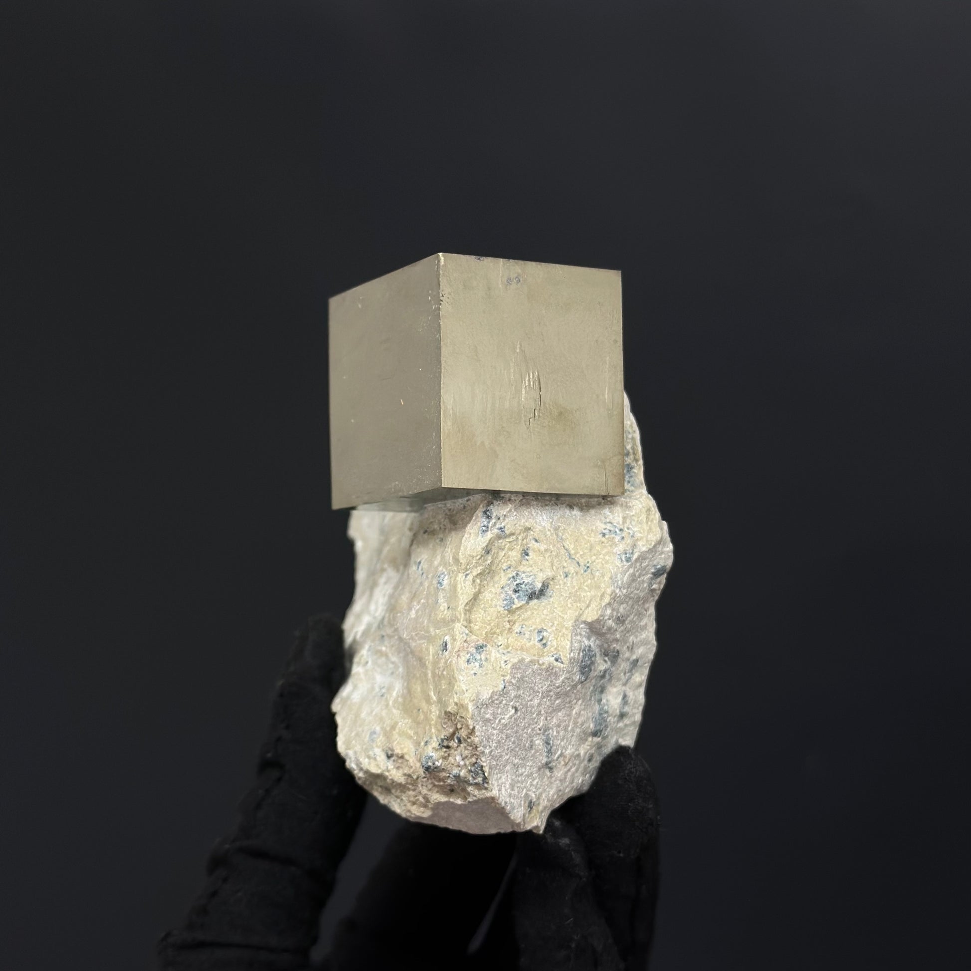 The perfect golden cubes nestled in the matrix are completely unique and captivating.