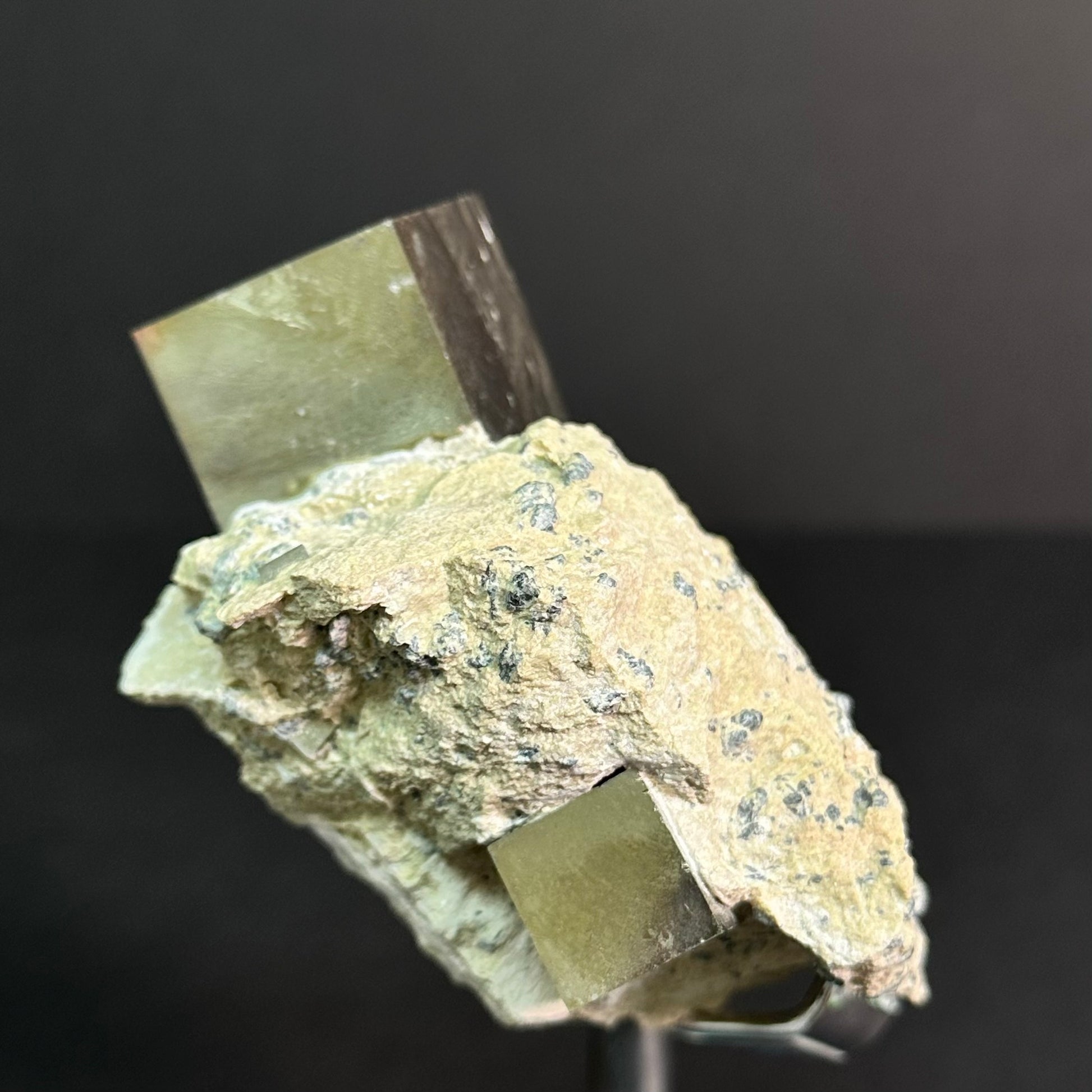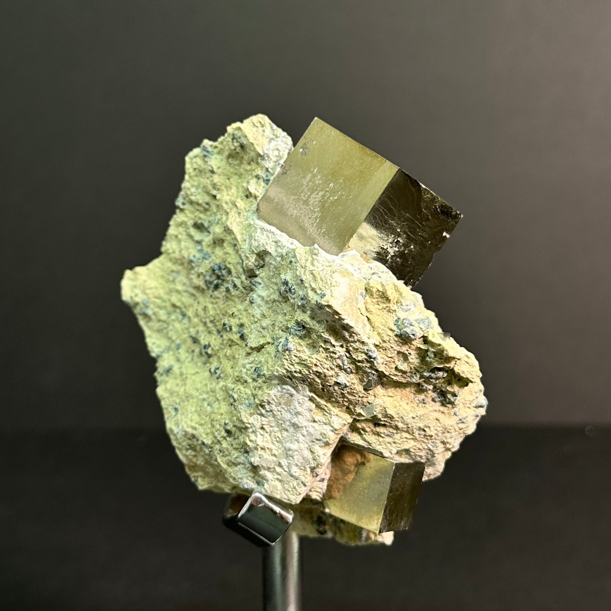 Display of Limestone Matrix with 2 Pyrite cubes is a real treasure. It beautifully shows how these crystals have grown and remained unchanged for millions of years.