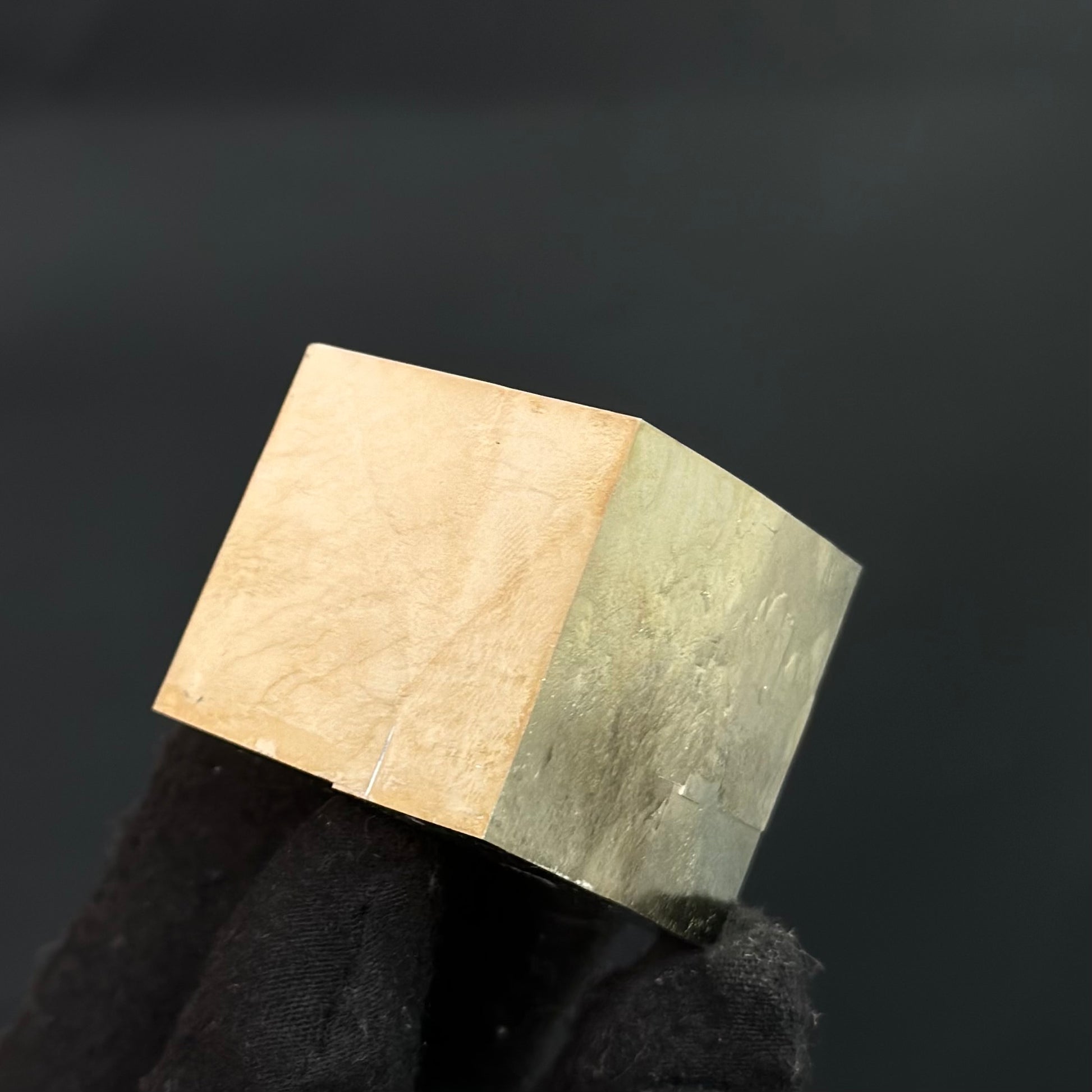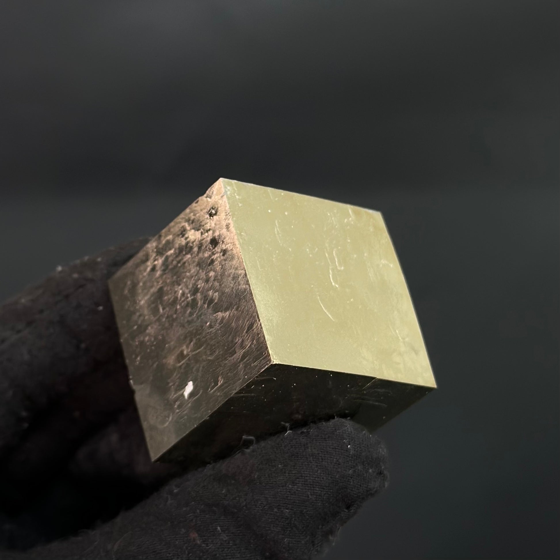 A high-quality sample of a single cube crystal from Pyrite Cubes, featuring well-defined terminations and perfect crystal faces with a metallic mirror luster.