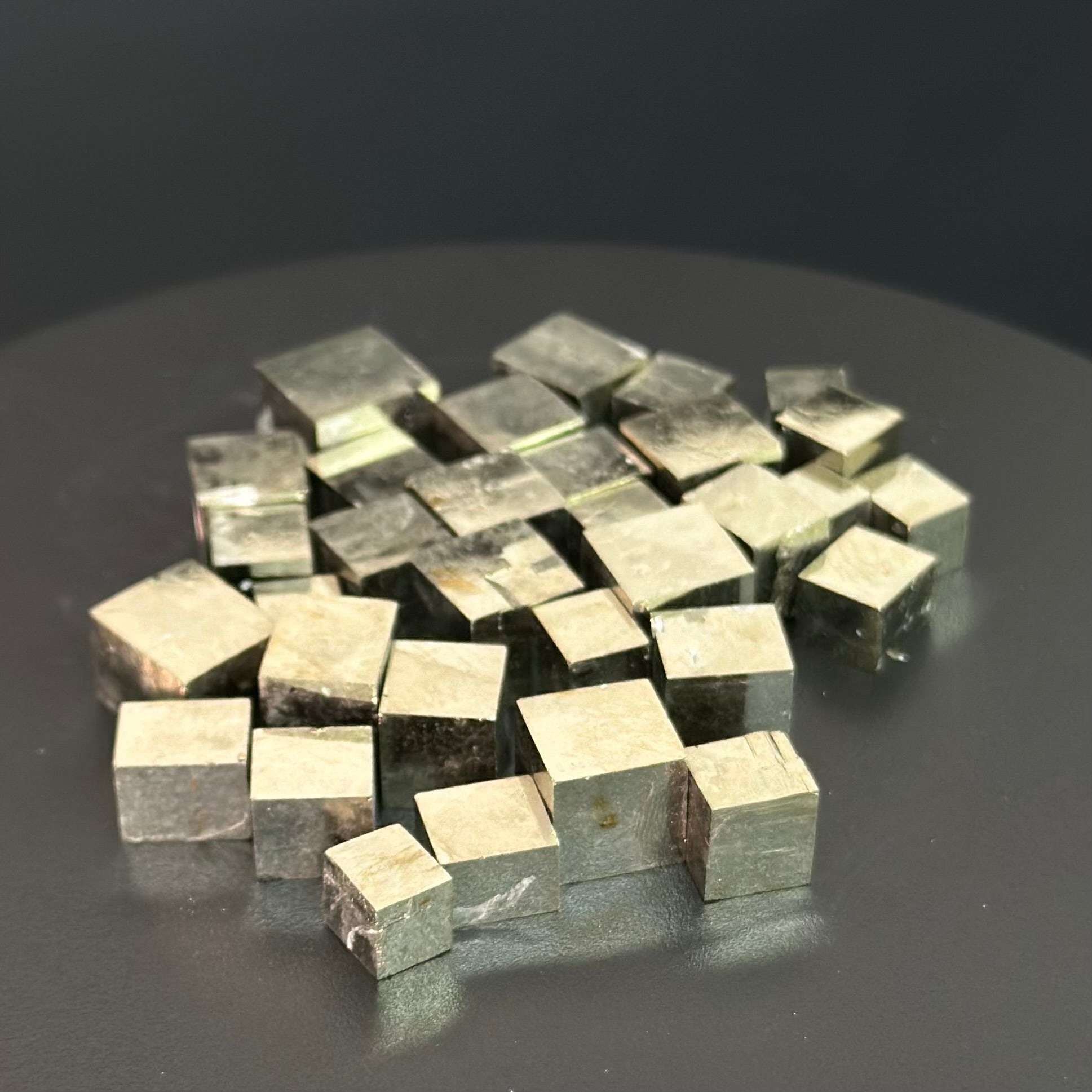 A high-quality sample of cube crystals from Pyrite Cubes, featuring well-defined terminations and perfect crystal faces with a metallic mirror luster.