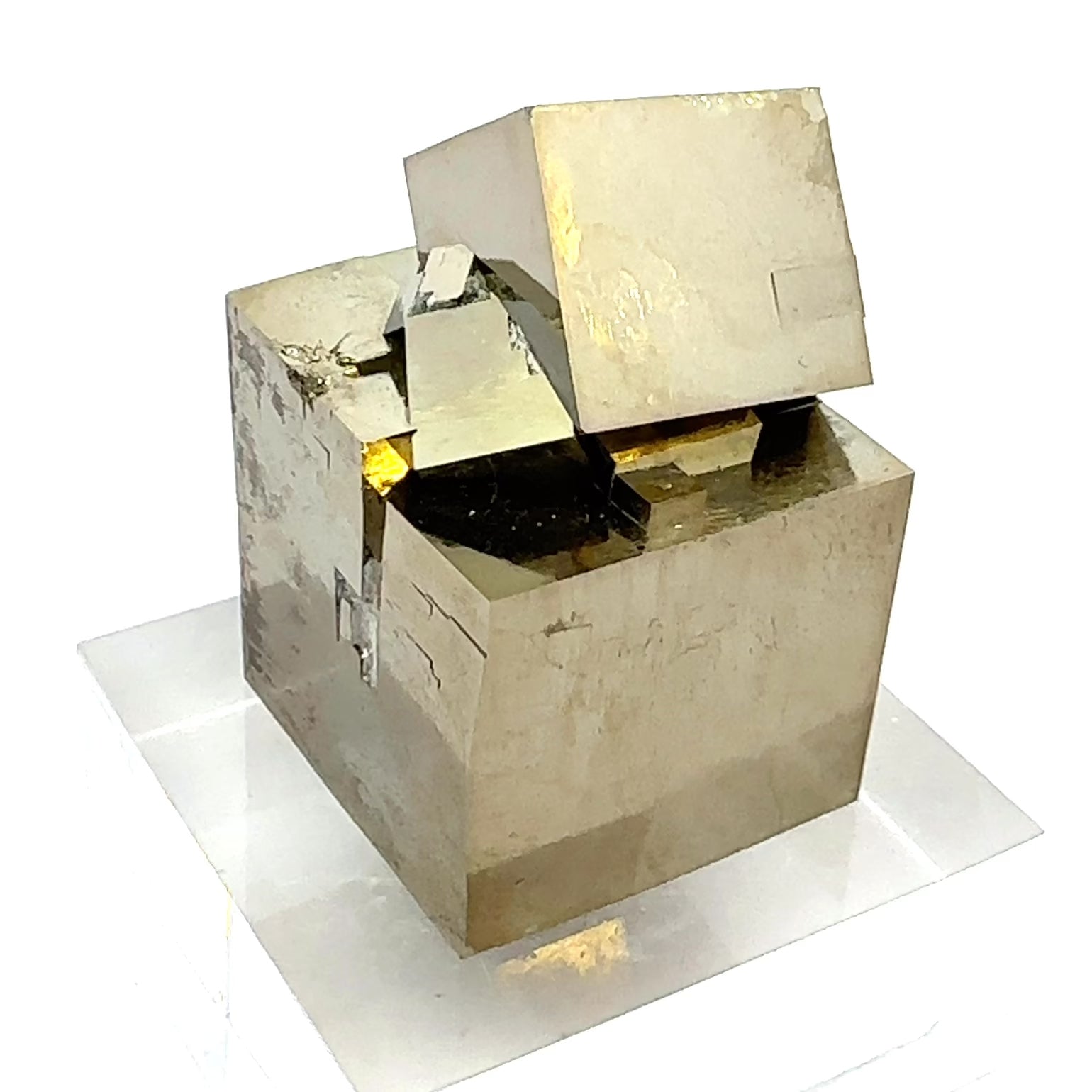 This unique pyrite specimen crystal cubes, naturally connected in a fascinating intertwining pattern. The high-quality mineral boasts a flawless surface and a brilliant golden shine.