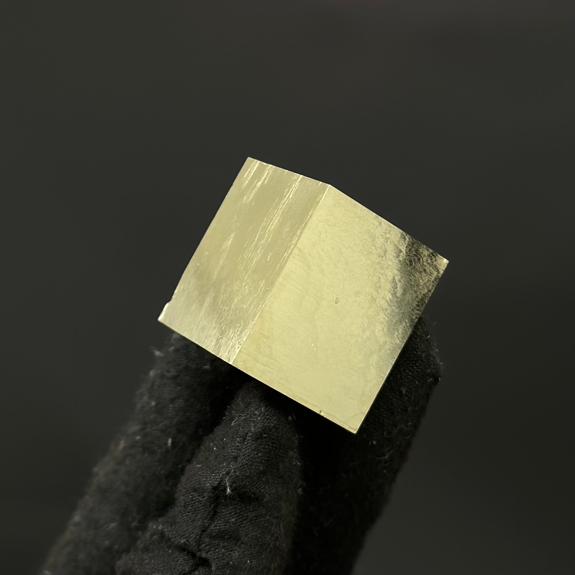 A high-quality sample of a single cube crystal from Pyrite Cubes, featuring well-defined terminations and perfect crystal faces with a metallic mirror luster.