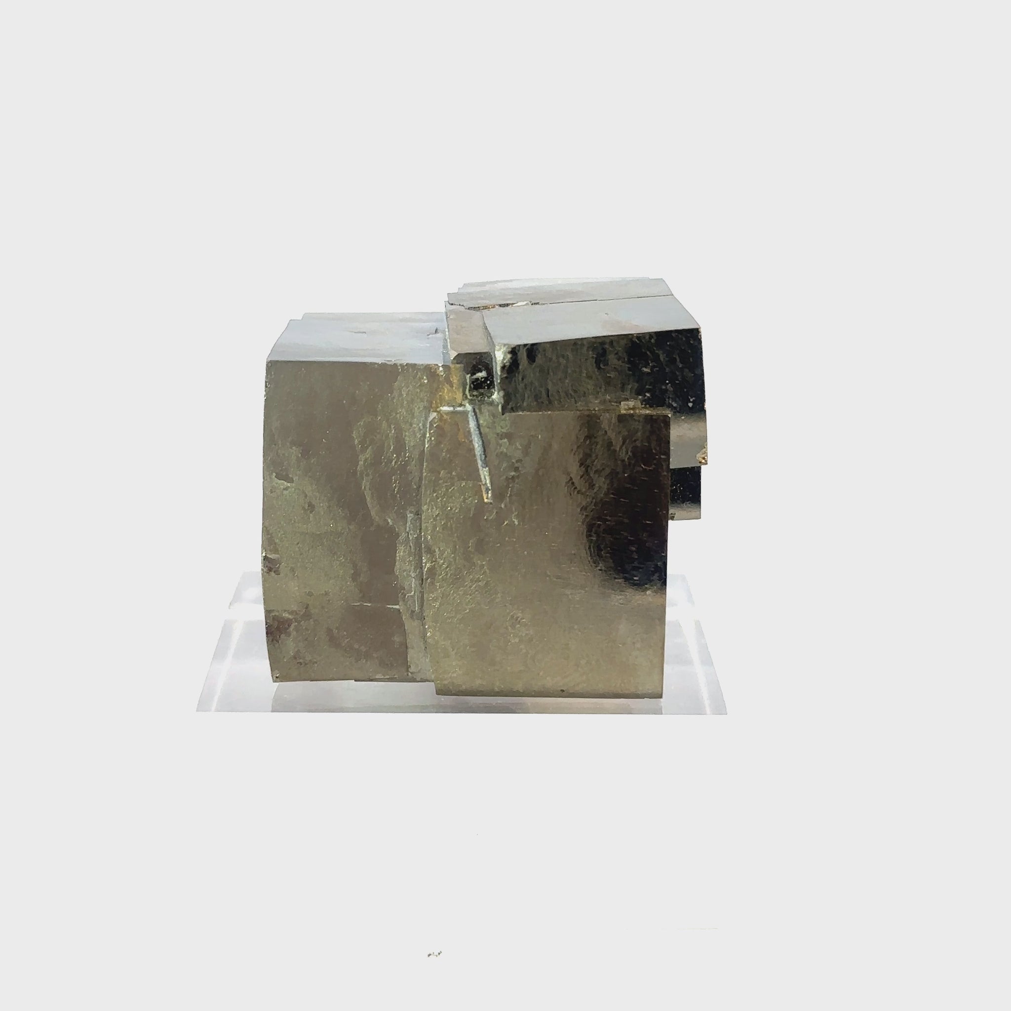 This unique pyrite specimen features 3 intergrown crystal cubes, naturally connected in a fascinating intertwining pattern. The high-quality mineral boasts a flawless surface and a brilliant golden shine. It is a treasure for any collector and would make an incredible, eye-catching gift.