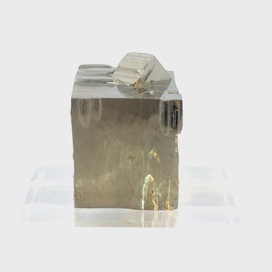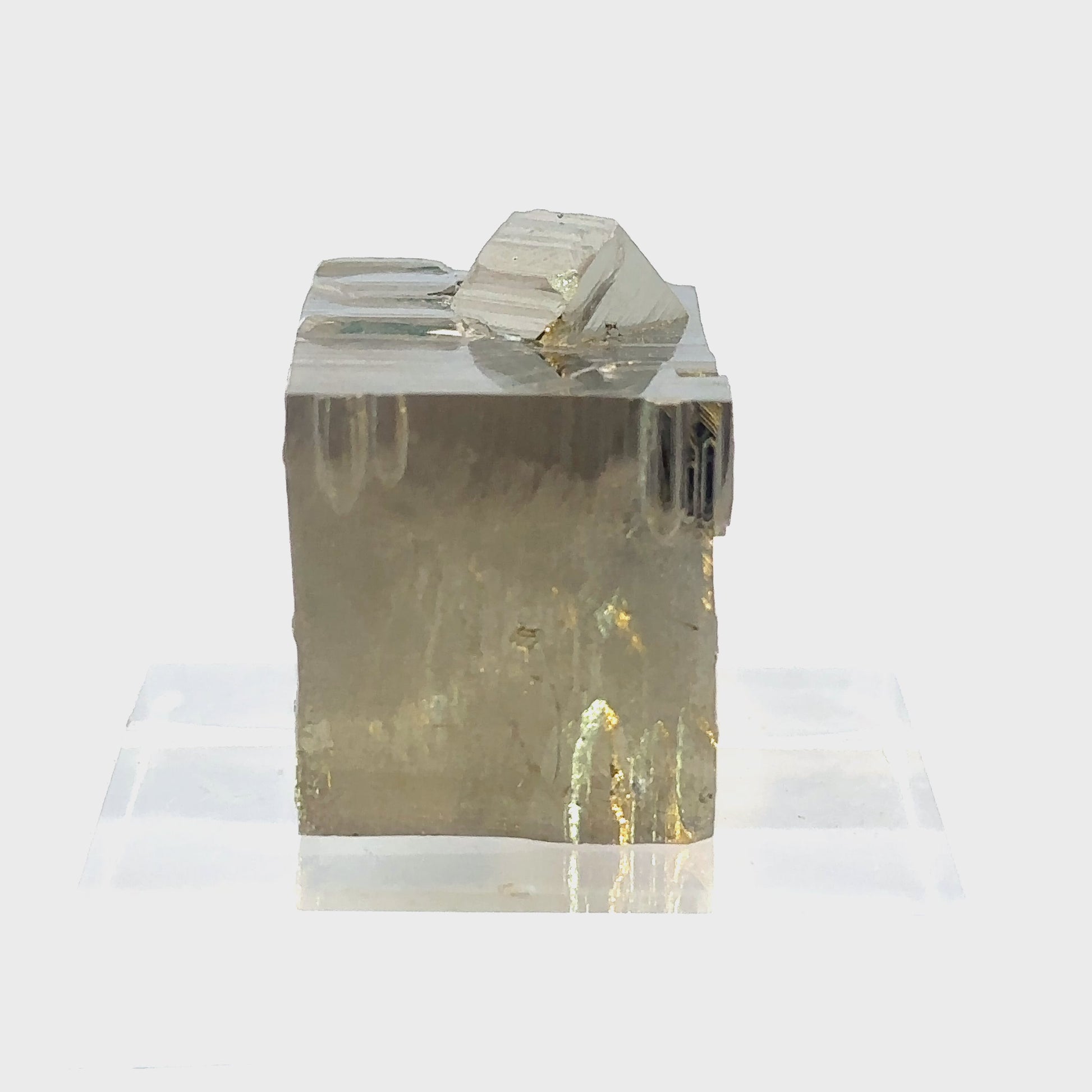 This unique pyrite specimen features 2 intergrown crystal cubes, naturally connected in a fascinating intertwining pattern. The high-quality mineral boasts a flawless surface and a brilliant golden shine. It is a treasure for any collector and would make an incredible, eye-catching gift.