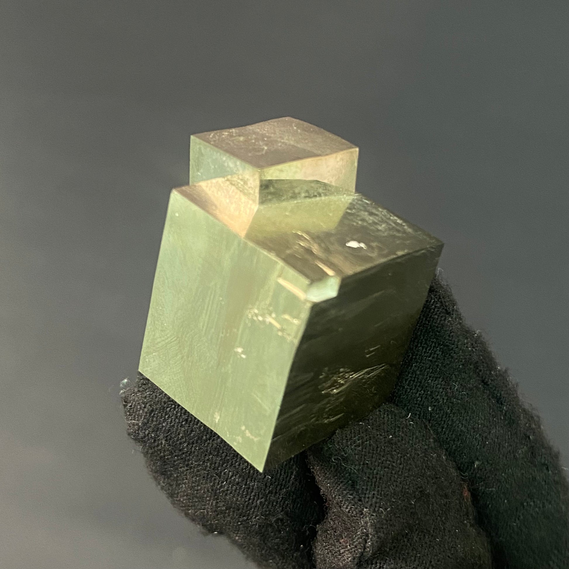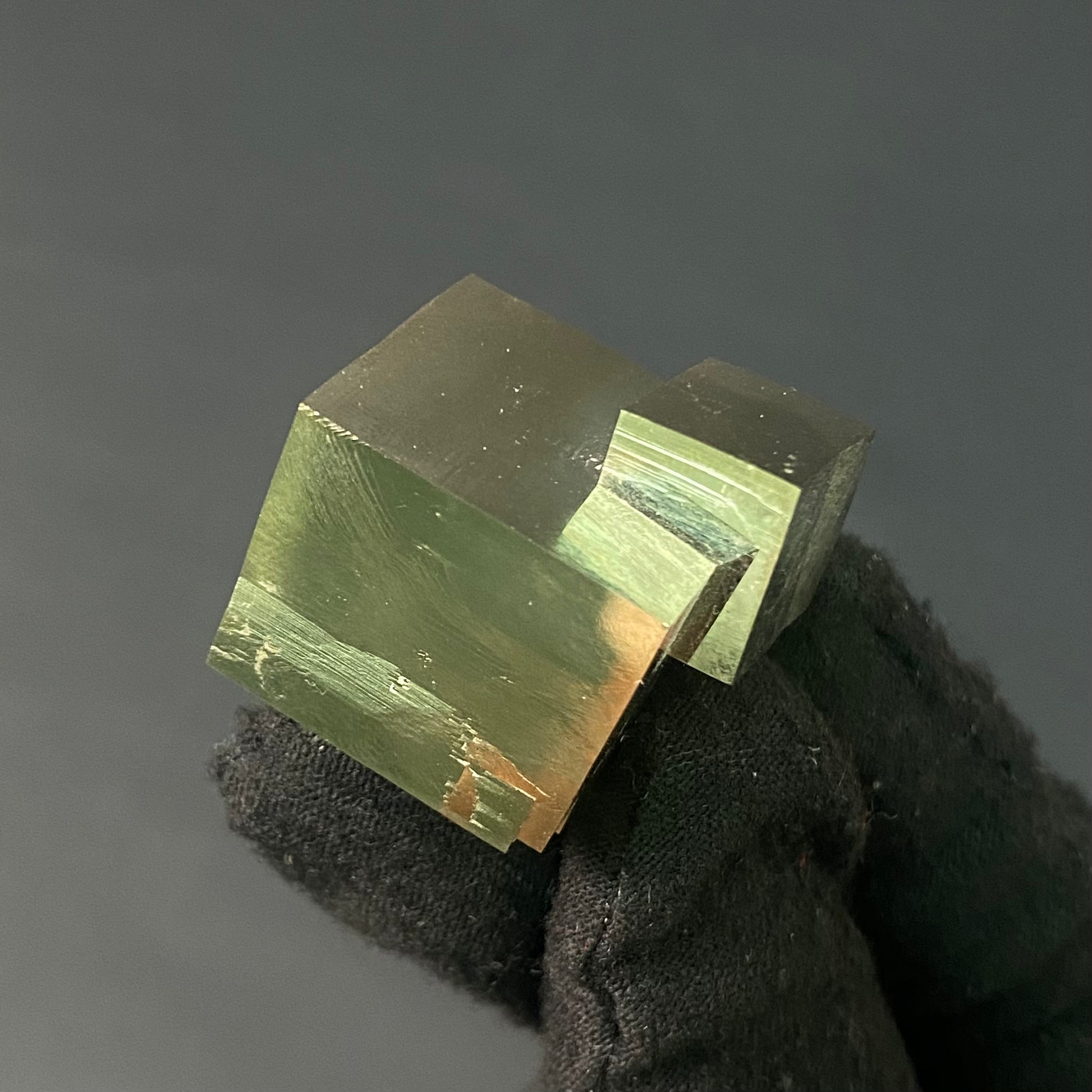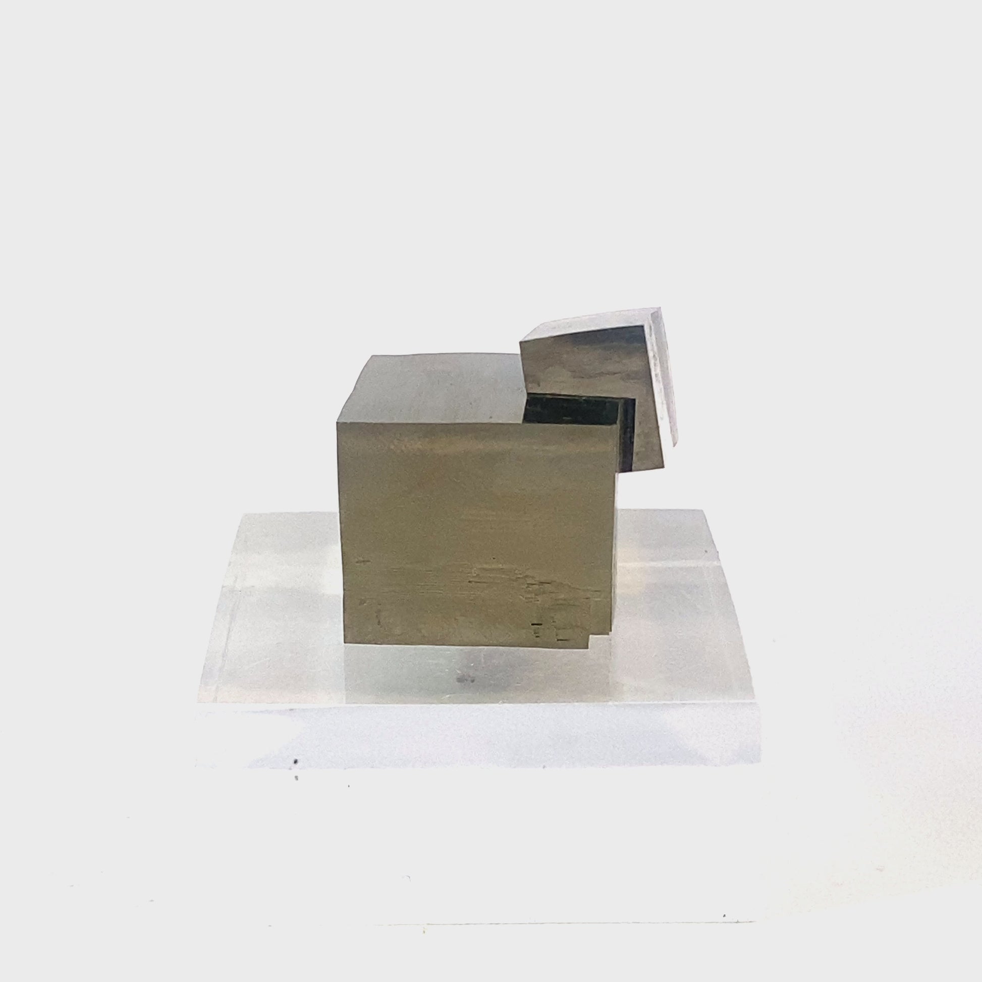 This unique pyrite specimen features 2 intergrown crystal cubes, naturally connected in a fascinating intertwining pattern. The high-quality mineral boasts a flawless surface and a brilliant golden shine. It is a treasure for any collector and would make an incredible, eye-catching gift.
