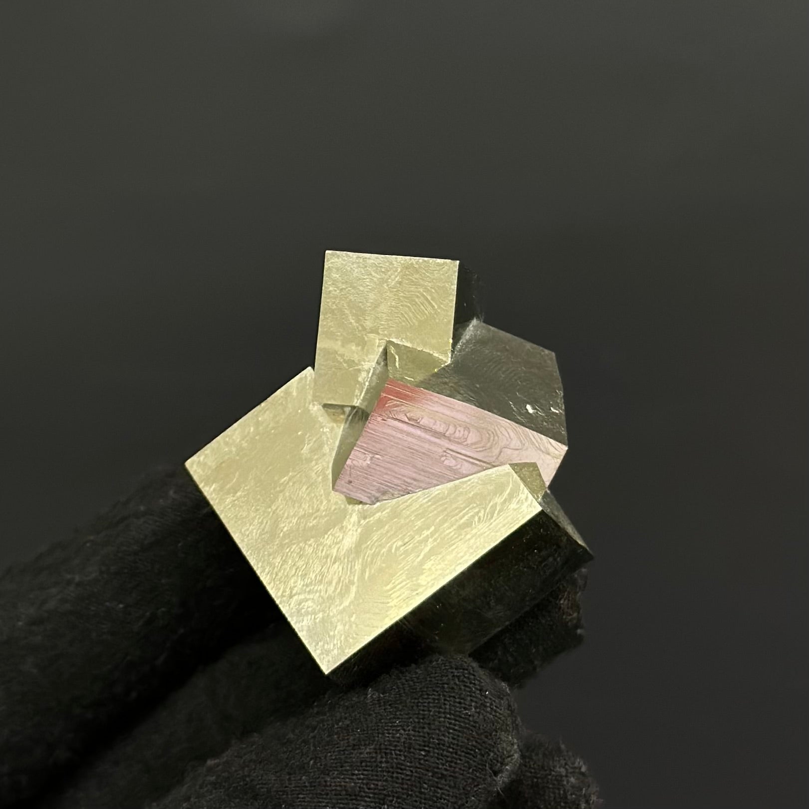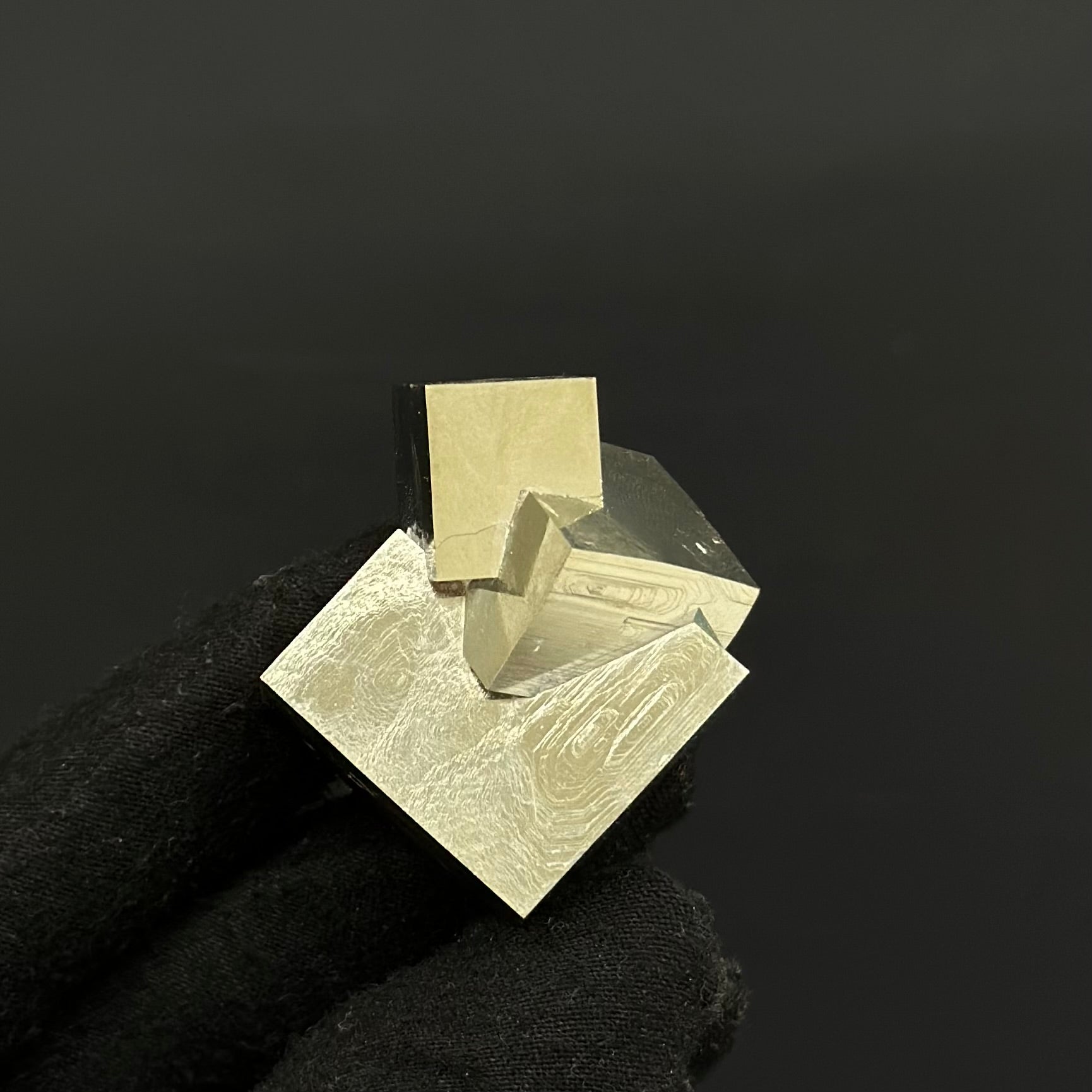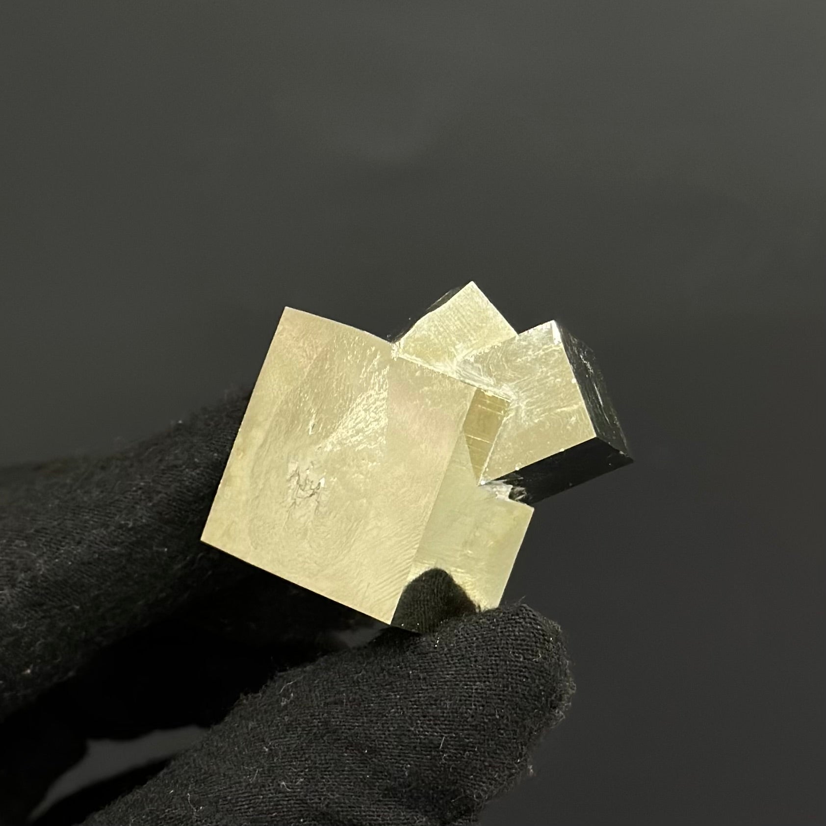 This unique pyrite specimen features 3 intergrown crystal cubes, naturally connected in a fascinating intertwining pattern. The high-quality mineral boasts a flawless surface and a brilliant golden shine. It is a treasure for any collector and would make an incredible, eye-catching gift.