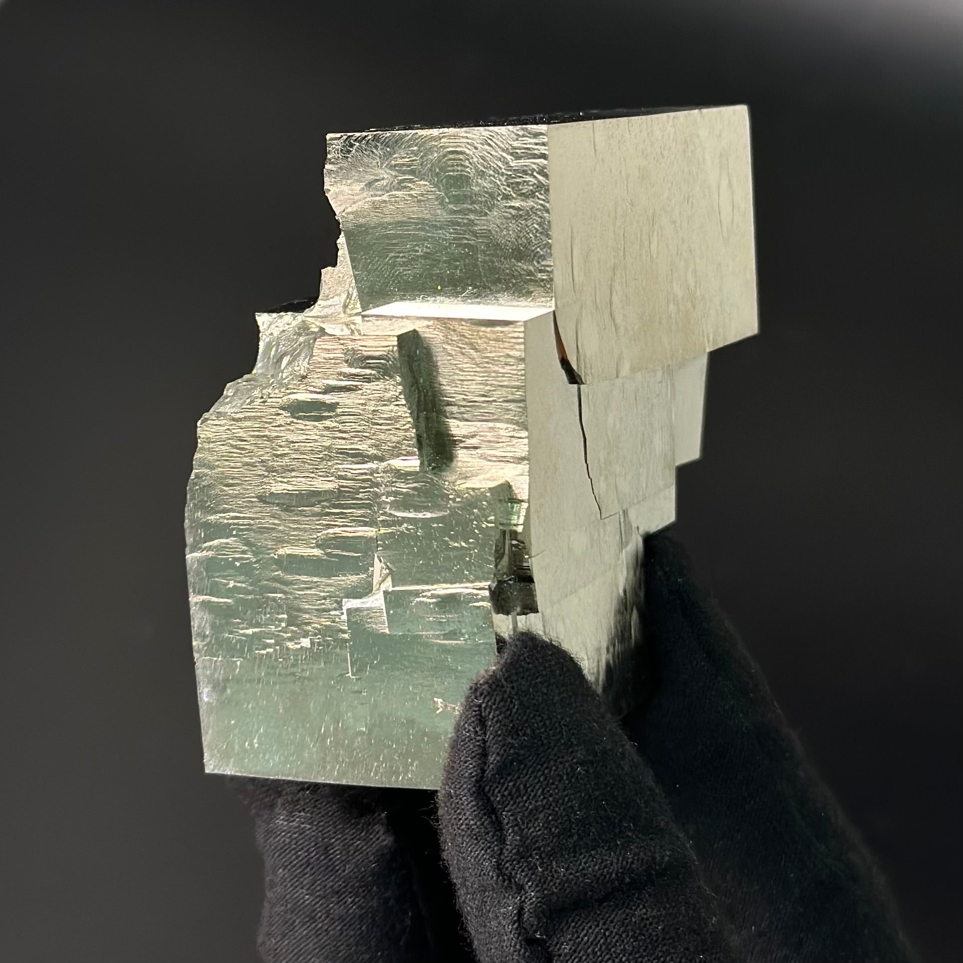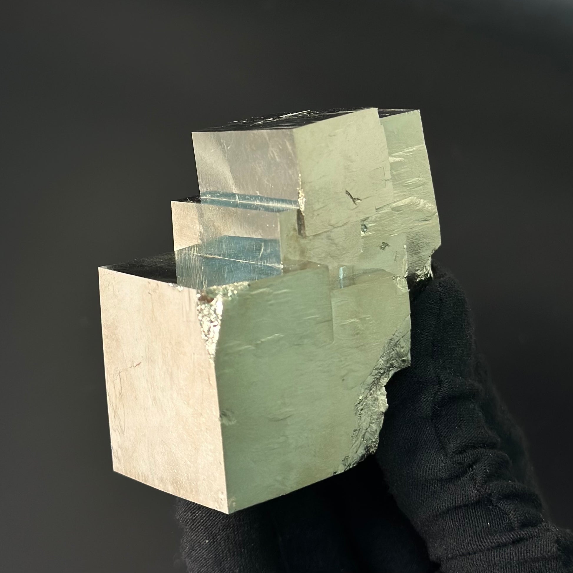 This unique pyrite specimen intergrown crystal cubes, naturally connected in a fascinating intertwining pattern. The high-quality mineral boasts a flawless surface, growth hillocks, and a brilliant golden shine. It is a treasure for any collector and would make an incredible, eye-catching gift.