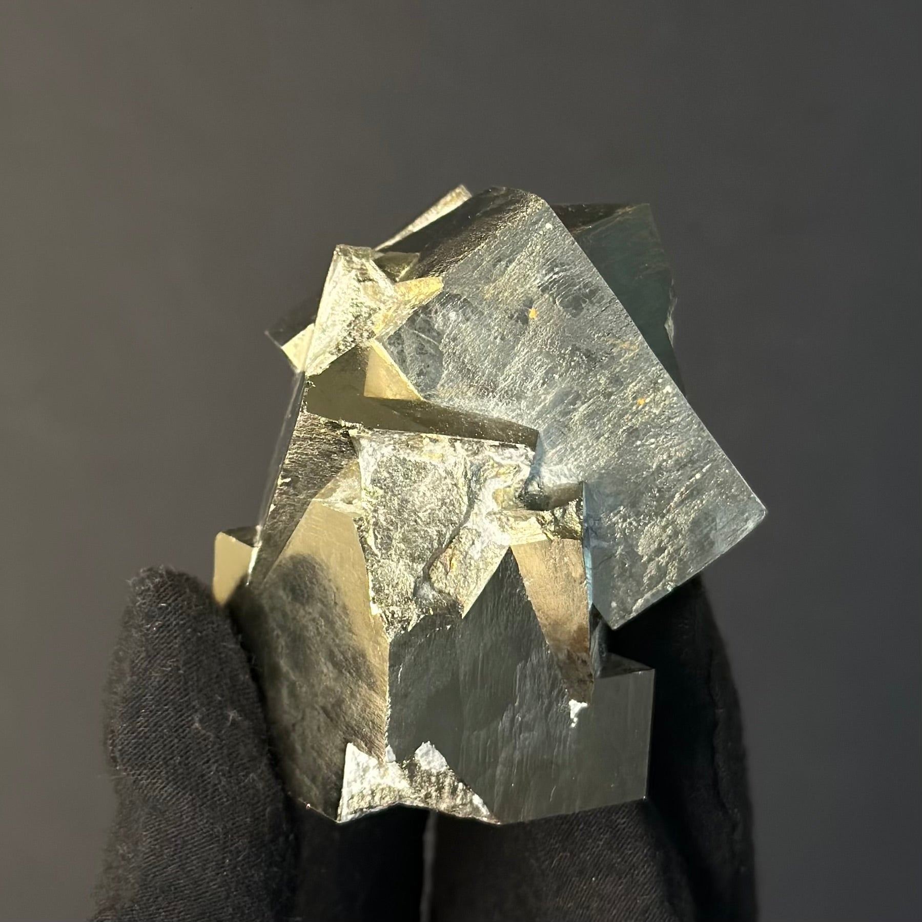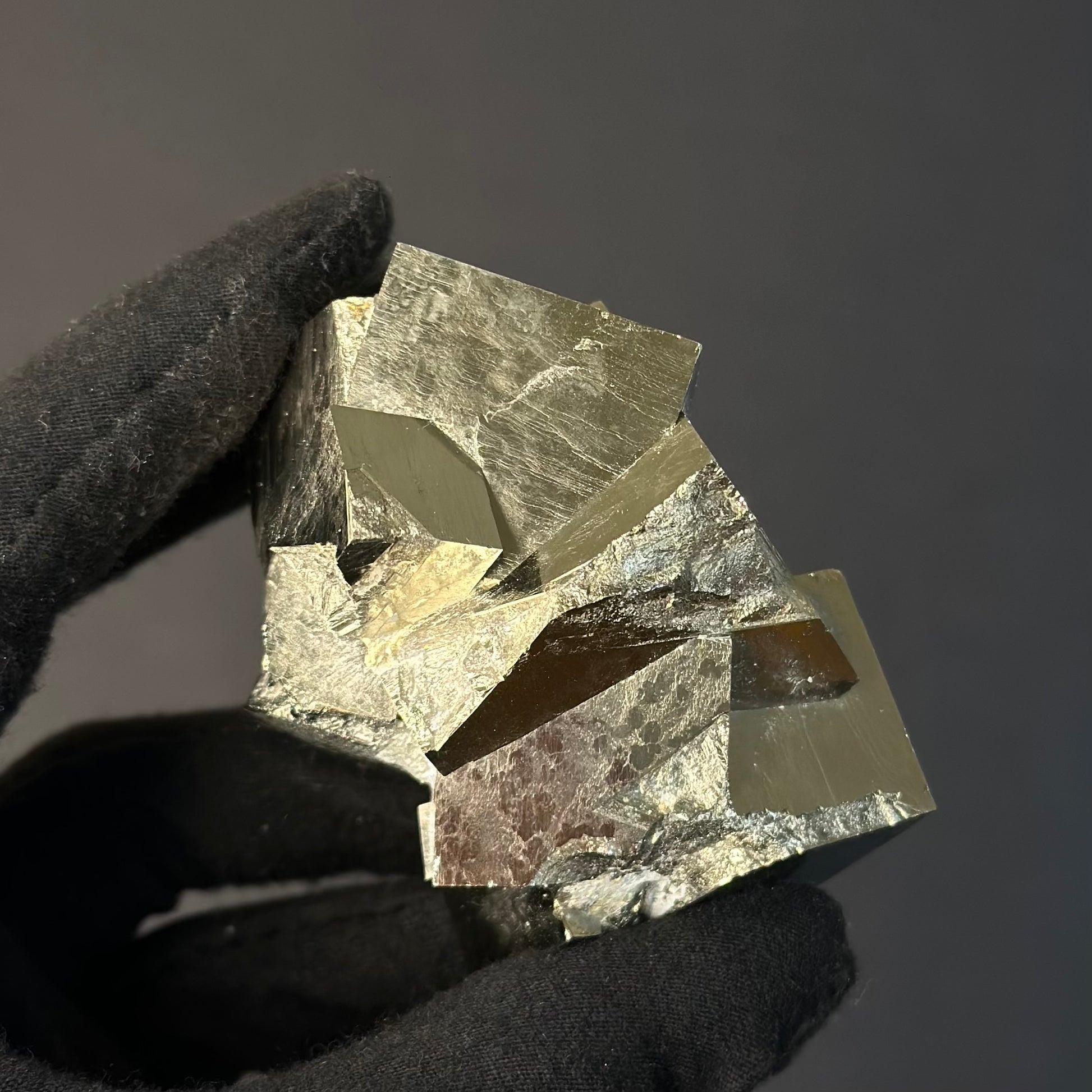 This unique pyrite specimen intergrown crystal cubes, naturally connected in a fascinating intertwining pattern. The high-quality mineral boasts a flawless surface, growth hillocks, and a brilliant golden shine. It is a treasure for any collector and would make an incredible, eye-catching gift.