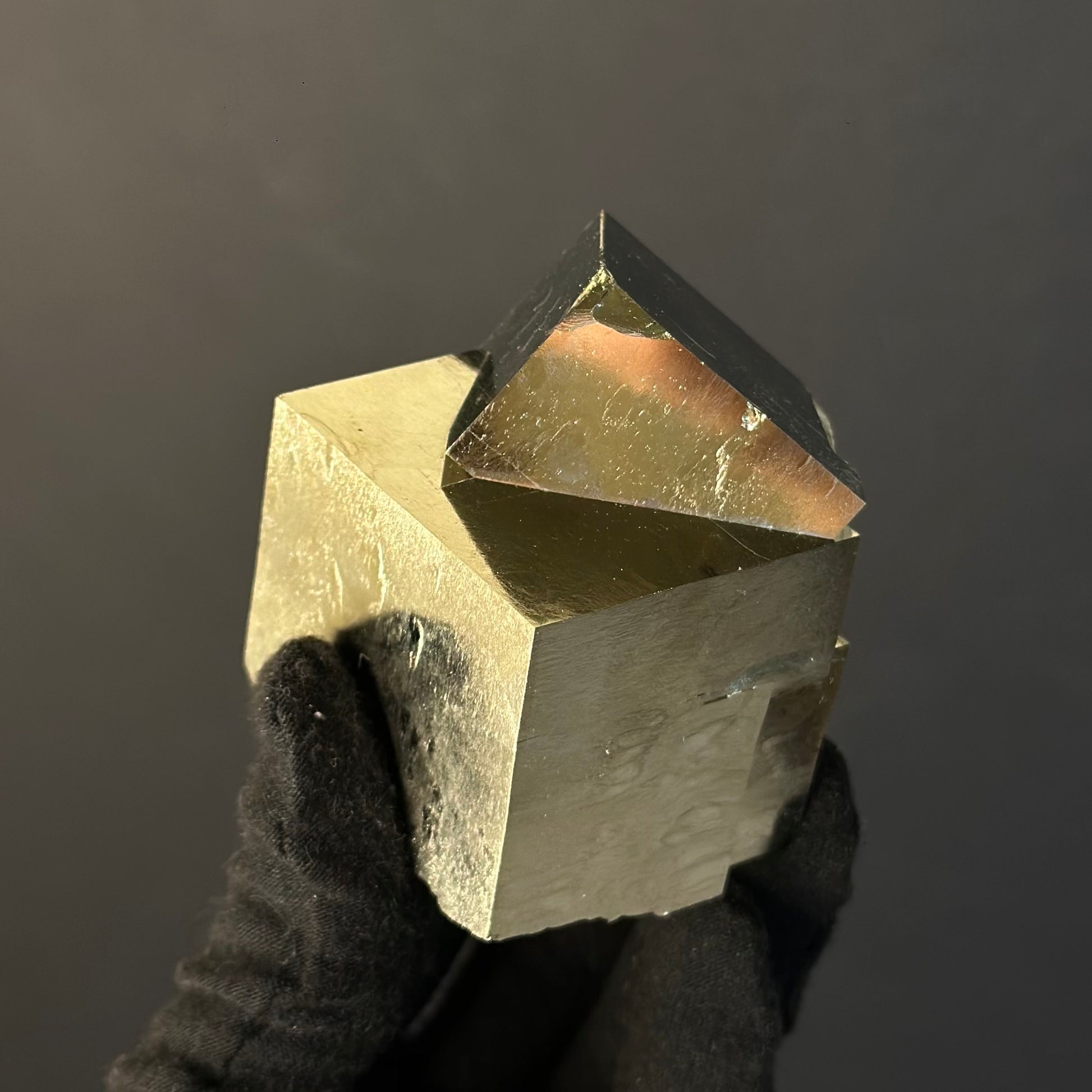 This unique pyrite specimen intergrown crystal cubes, naturally connected in a fascinating intertwining pattern. The high-quality mineral boasts a flawless surface, growth hillocks, and a brilliant golden shine. It is a treasure for any collector and would make an incredible, eye-catching gift.