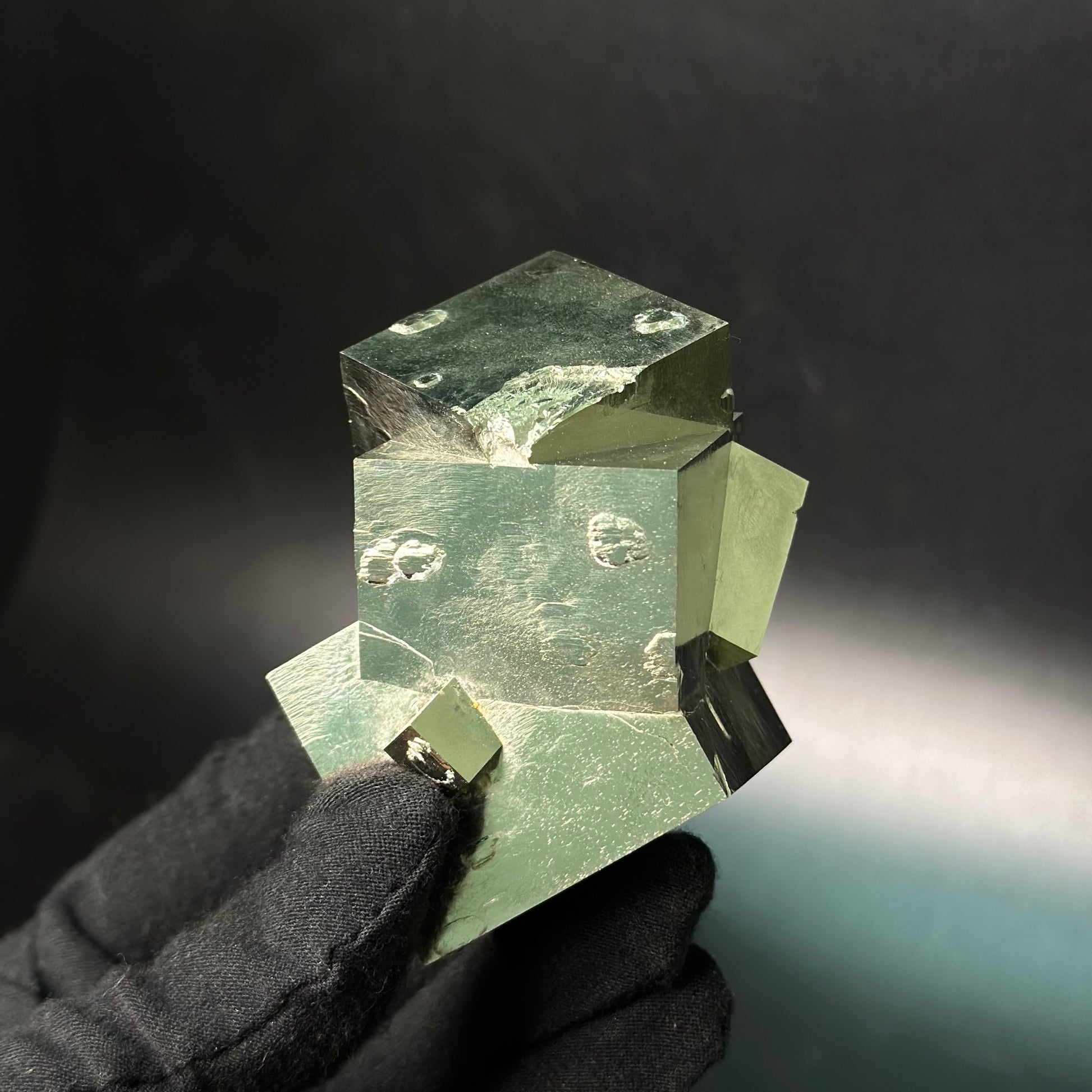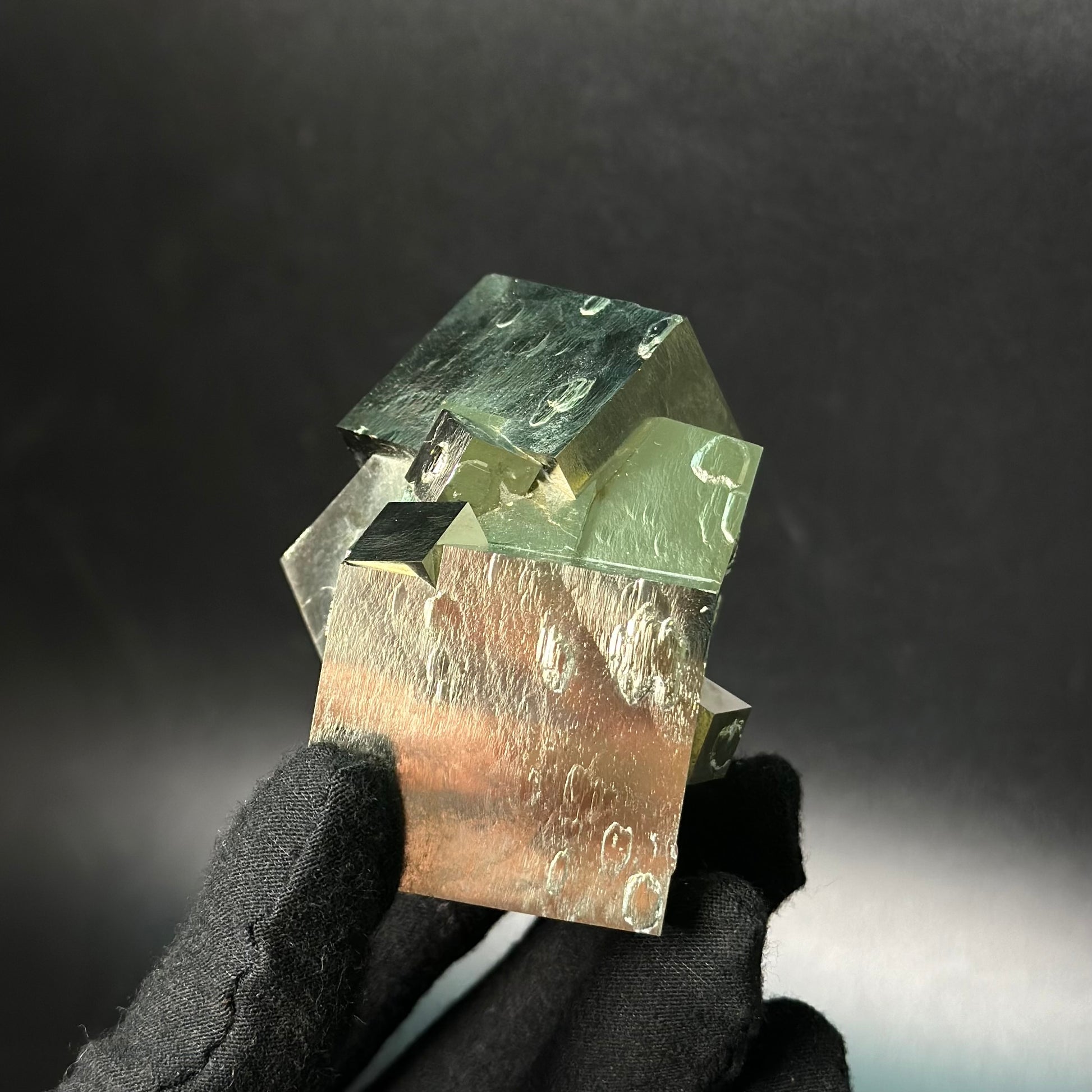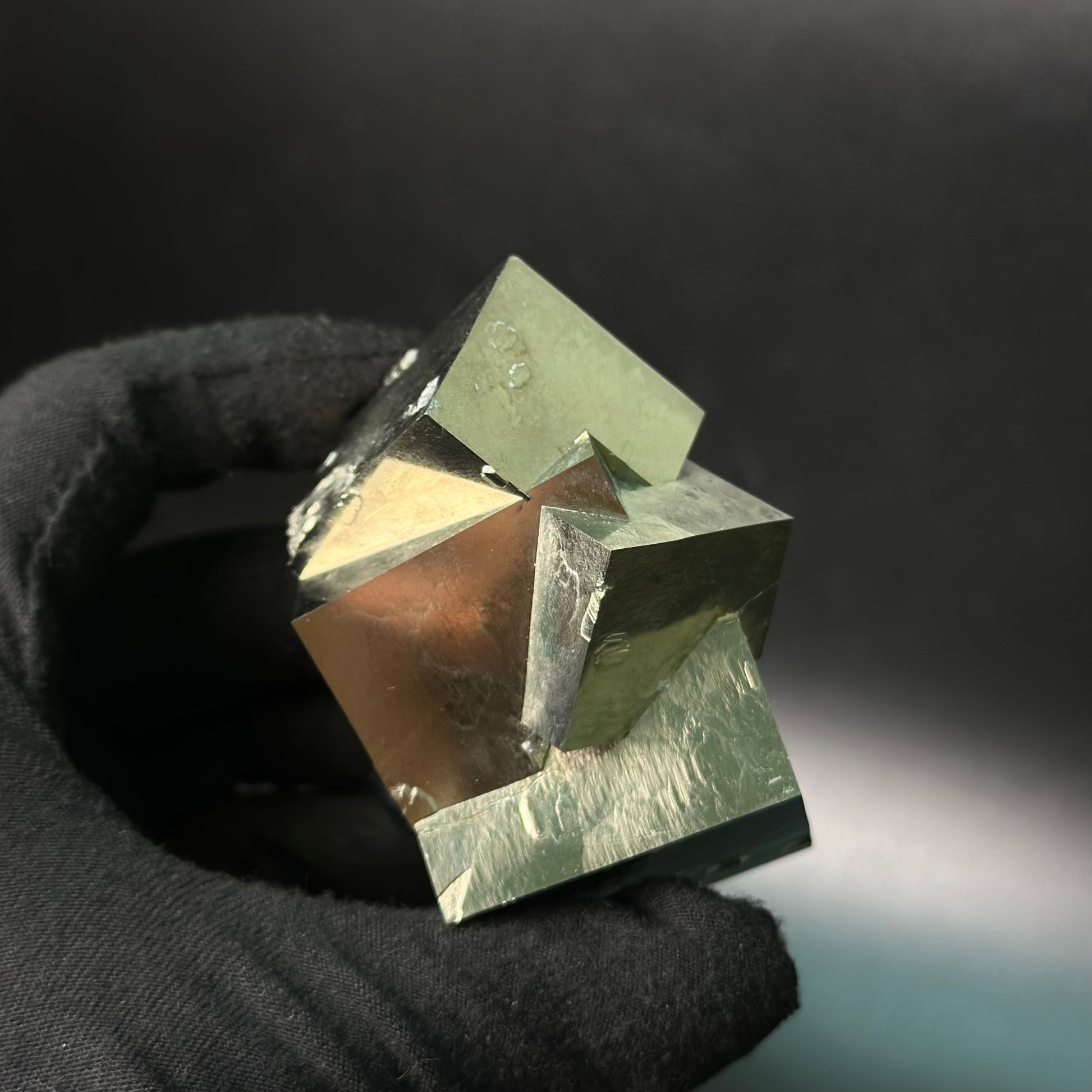 This unique pyrite specimen intergrown crystal cubes, naturally connected in a fascinating intertwining pattern. The high-quality mineral boasts a flawless surface, growth hillocks, and a brilliant golden shine. It is a treasure for any collector and would make an incredible, eye-catching gift.