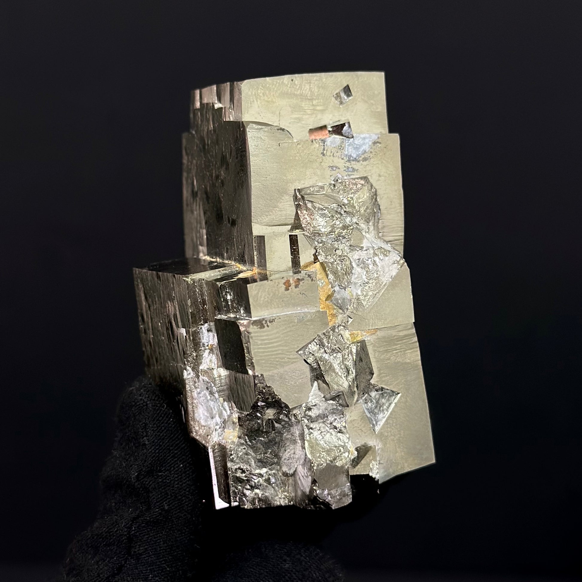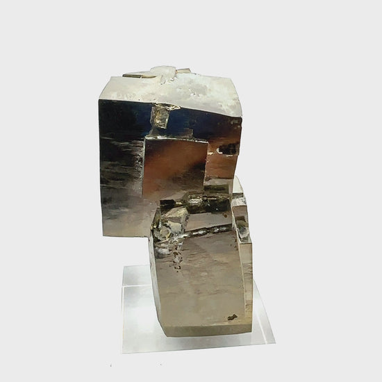 Pyrite specimen features 9 intergrown crystal cubes, naturally connected in a fascinating intertwining pattern.