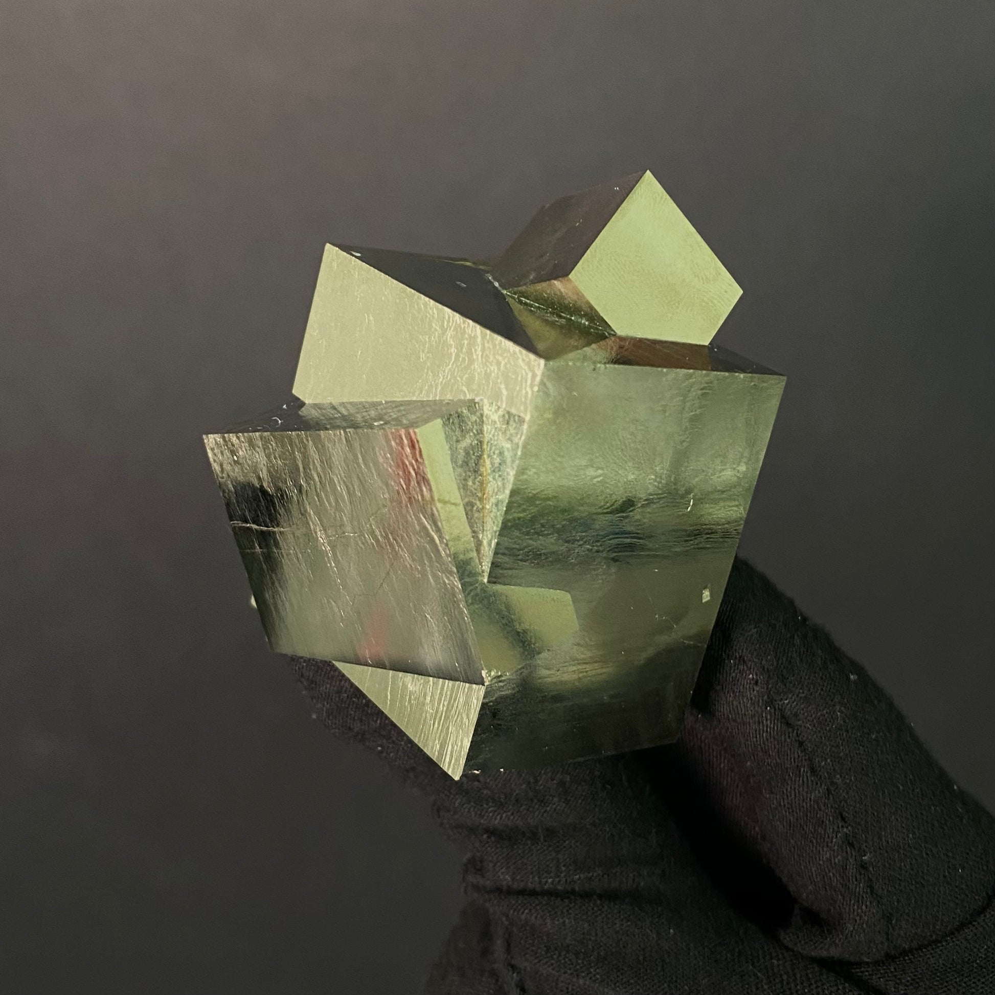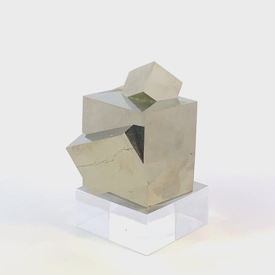 Pyrite specimen features 4 intergrown crystal cubes, naturally connected in a fascinating intertwining pattern.