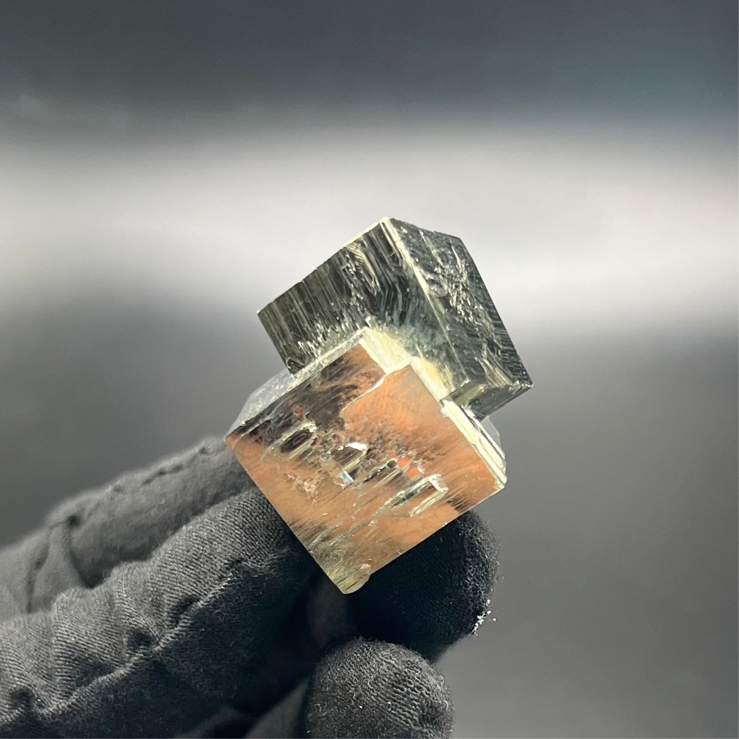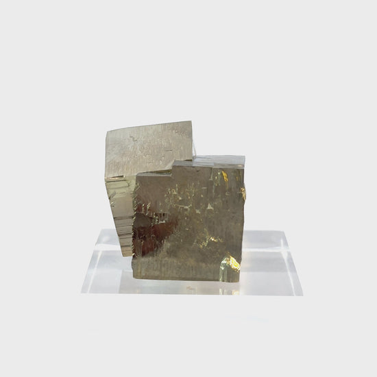 This unique pyrite specimen features 3 intergrown crystal cubes, naturally connected in a fascinating intertwining pattern. The high-quality mineral boasts a flawless surface and a brilliant golden shine. It is a treasure for any collector and would make an incredible, eye-catching gift.
