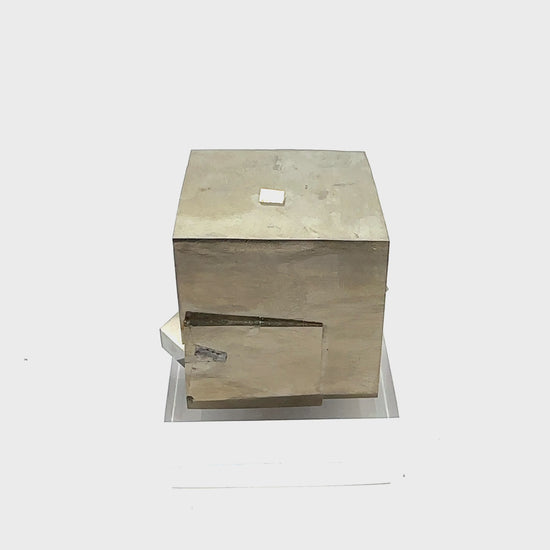 This unique pyrite specimen features 2 intergrown crystal cubes, naturally connected in a fascinating intertwining pattern. The high-quality mineral boasts a flawless surface and a brilliant golden shine. It is a treasure for any collector and would make an incredible, eye-catching gift.