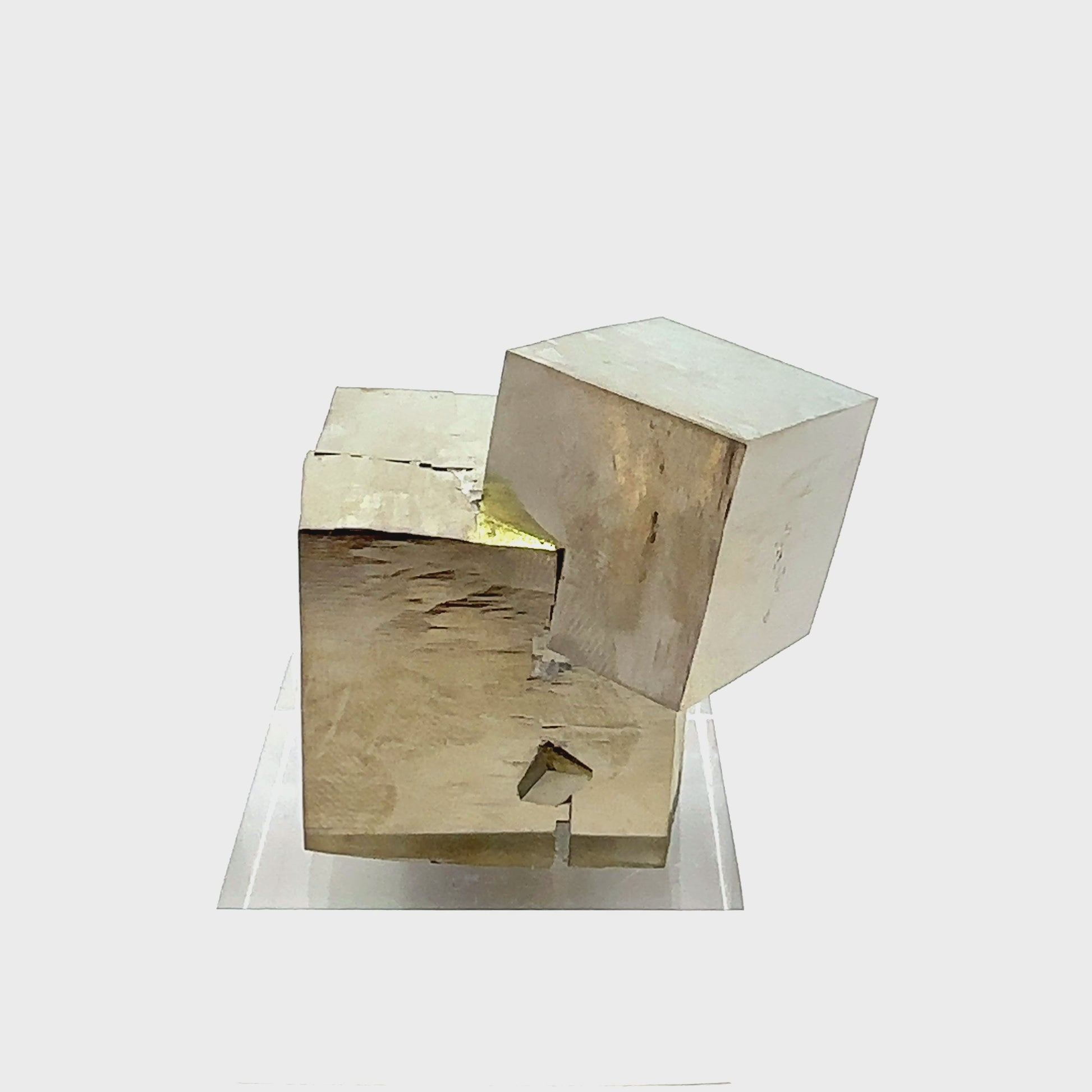 This unique pyrite specimen features 2 intergrown crystal cubes, naturally connected in a fascinating intertwining pattern. The high-quality mineral boasts a flawless surface and a brilliant golden shine.
