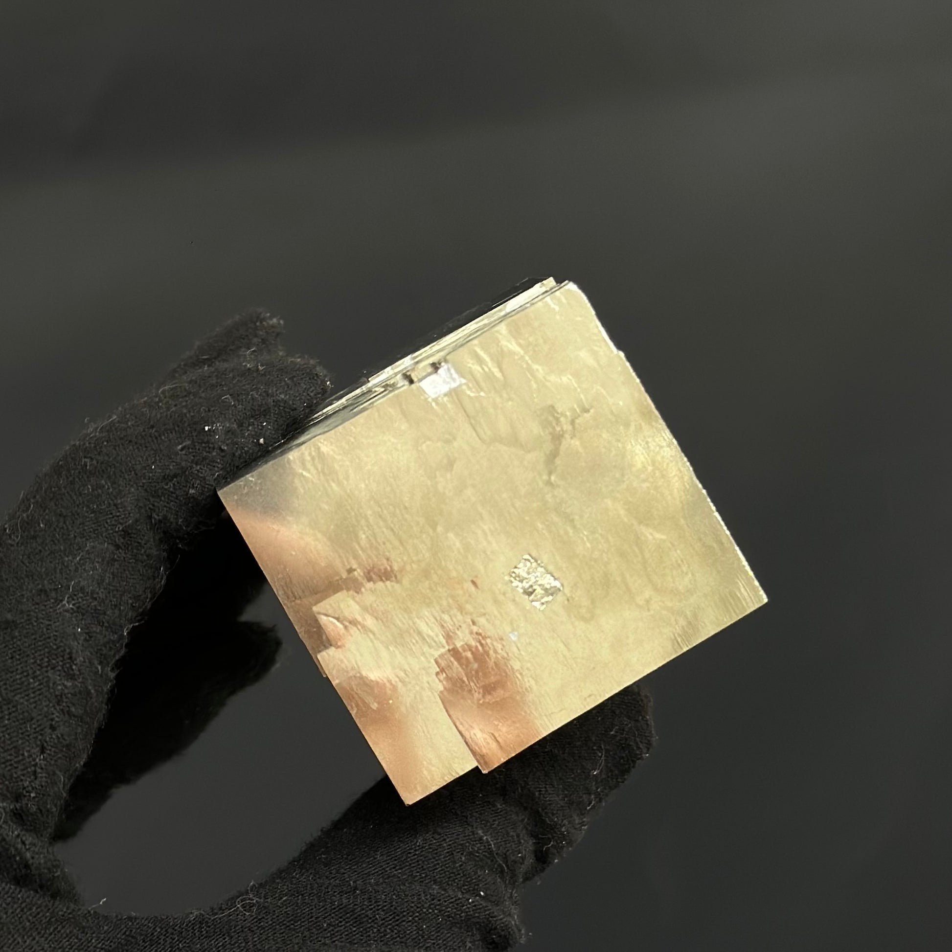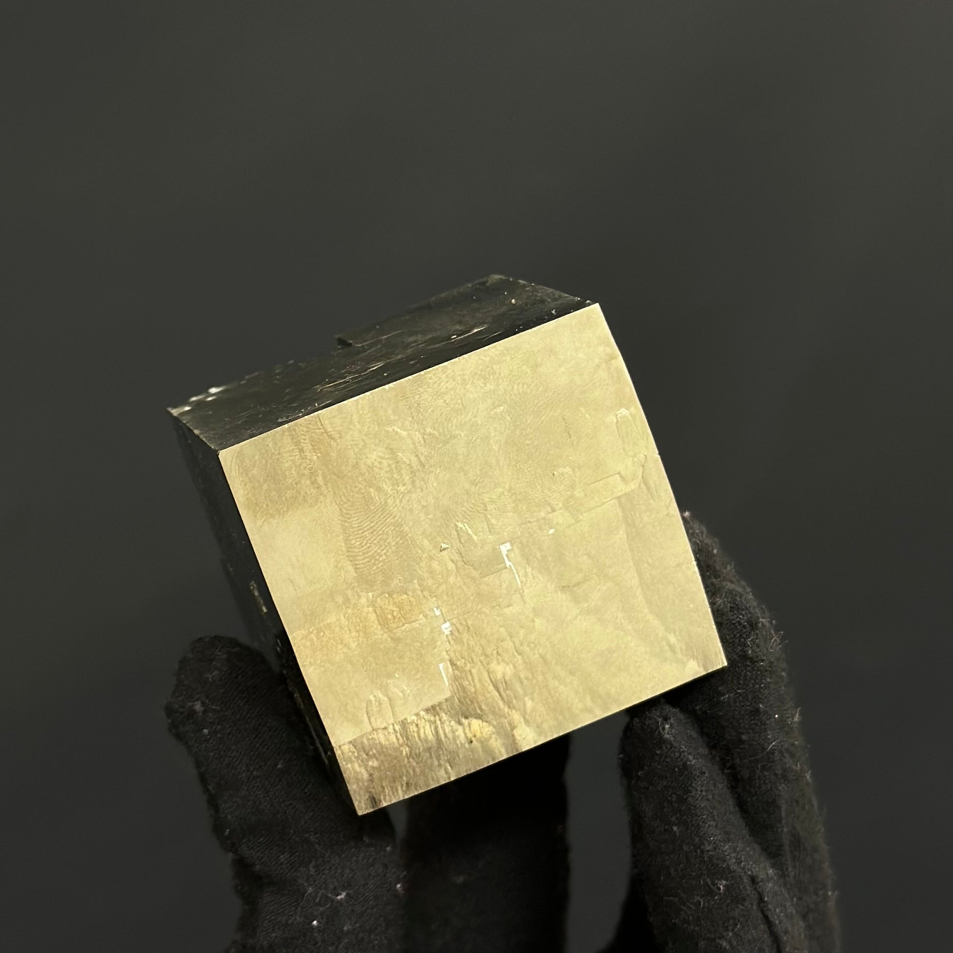 A high-quality sample of a single cube crystal from Pyrite Cubes, featuring well-defined terminations and perfect crystal faces with a metallic mirror luster.