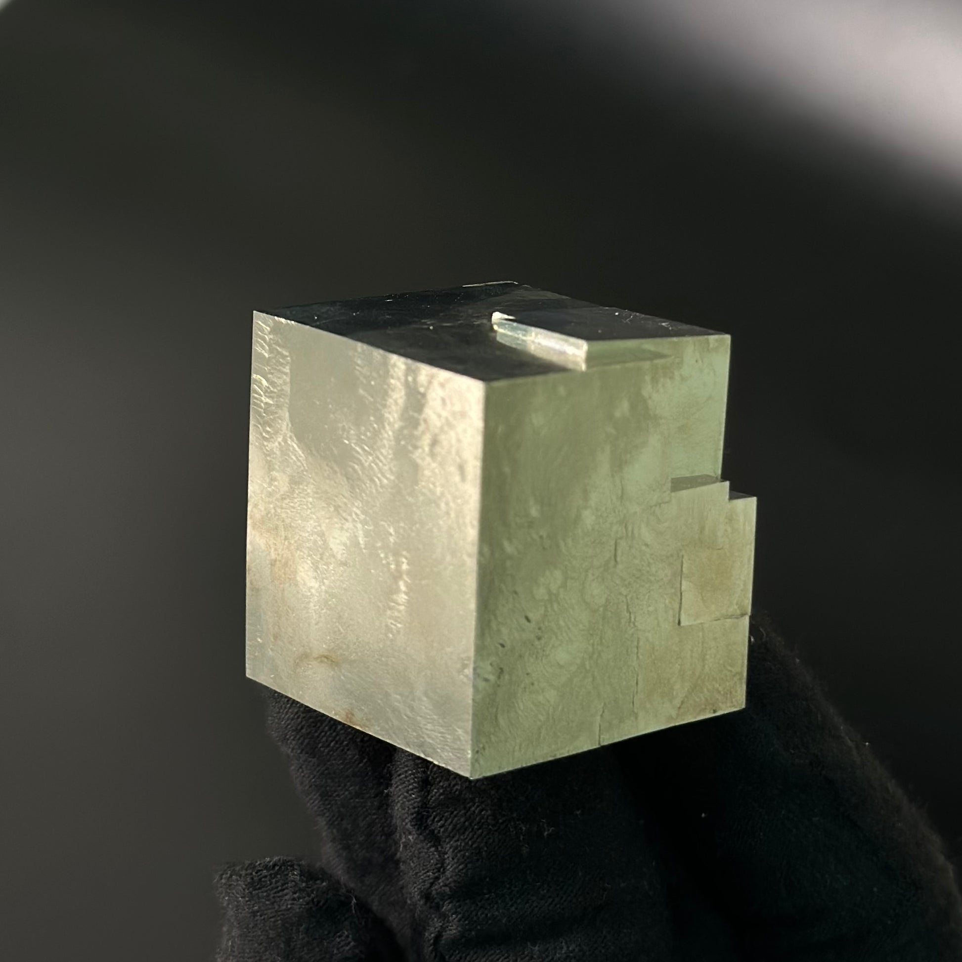This high-quality piece displays a single pyrite cube that has formed in a unique shape, with step like details on some of the edges of the piece. It also boasts flawless surfaces, corners, and edges making it a treasure for any collector and would make an incredible, eye-catching gift.