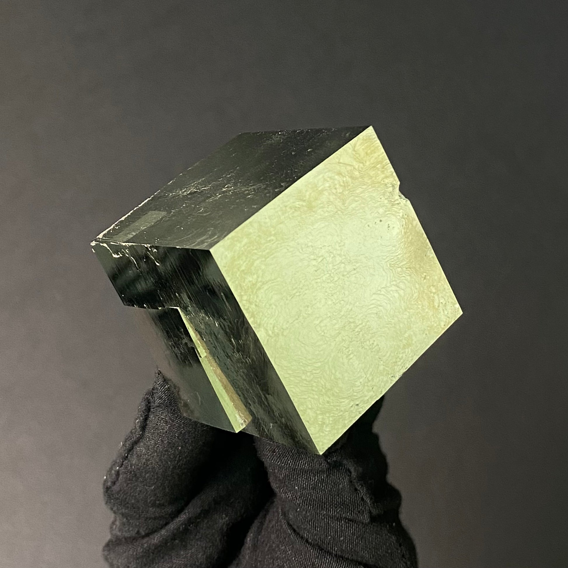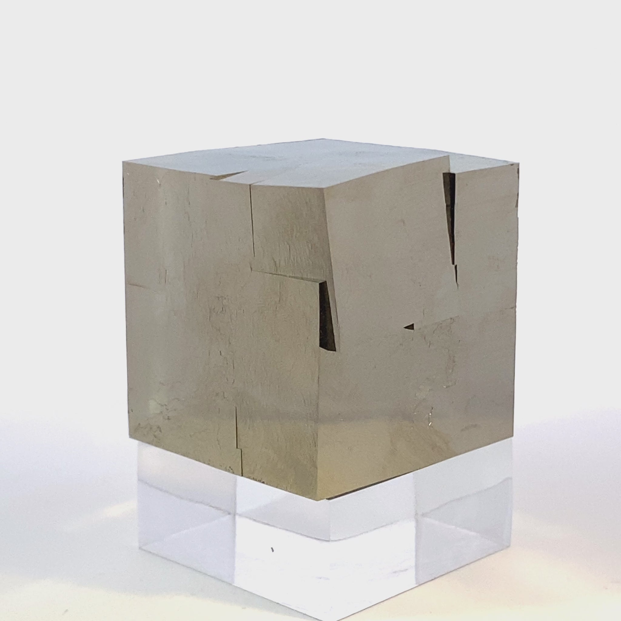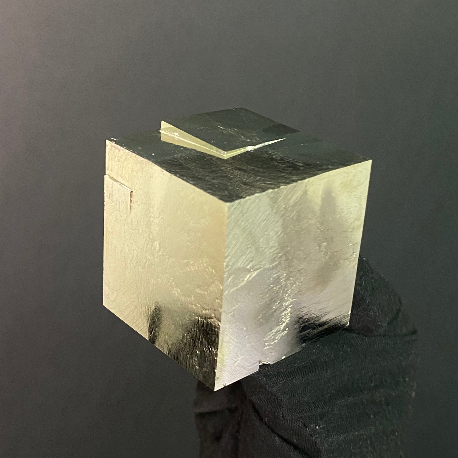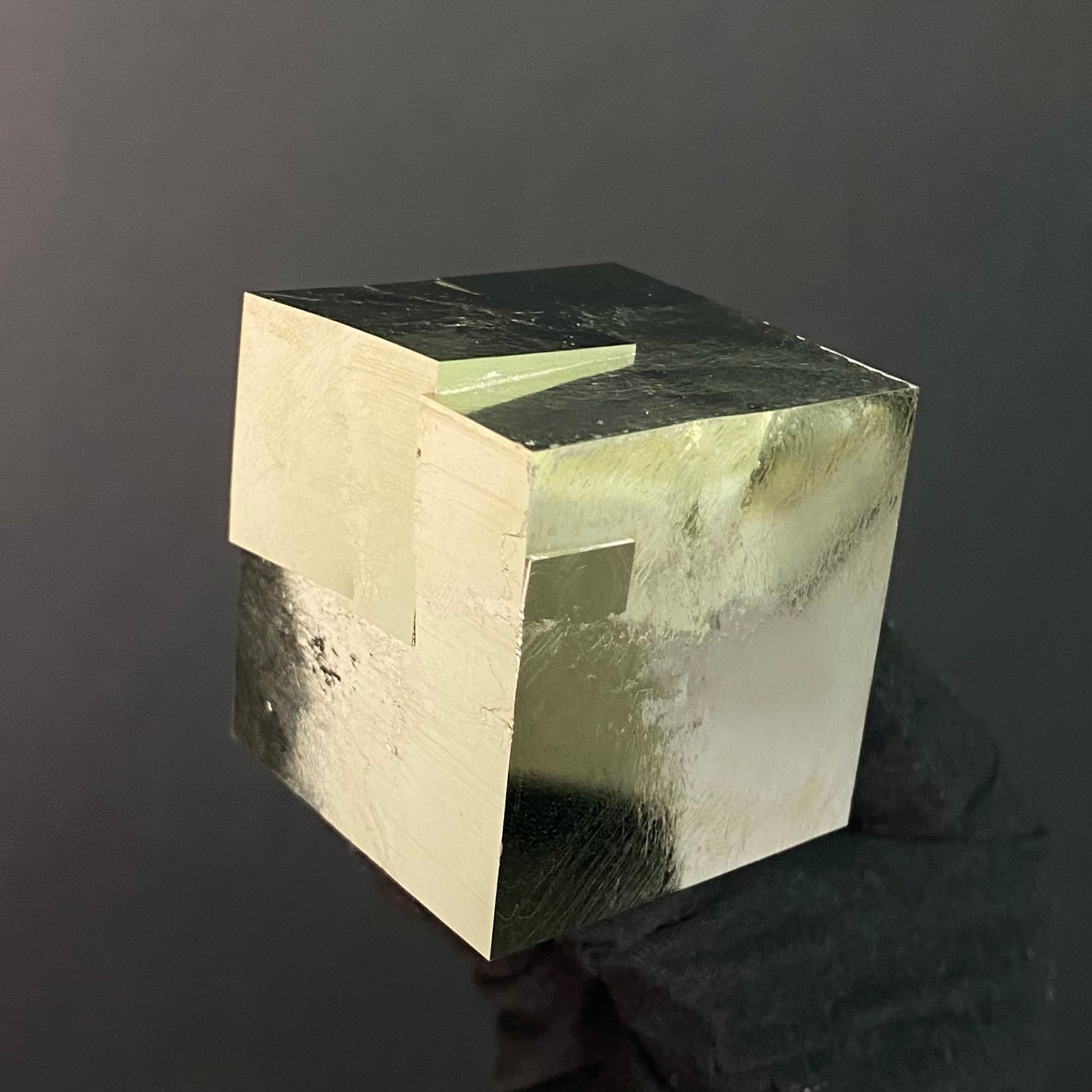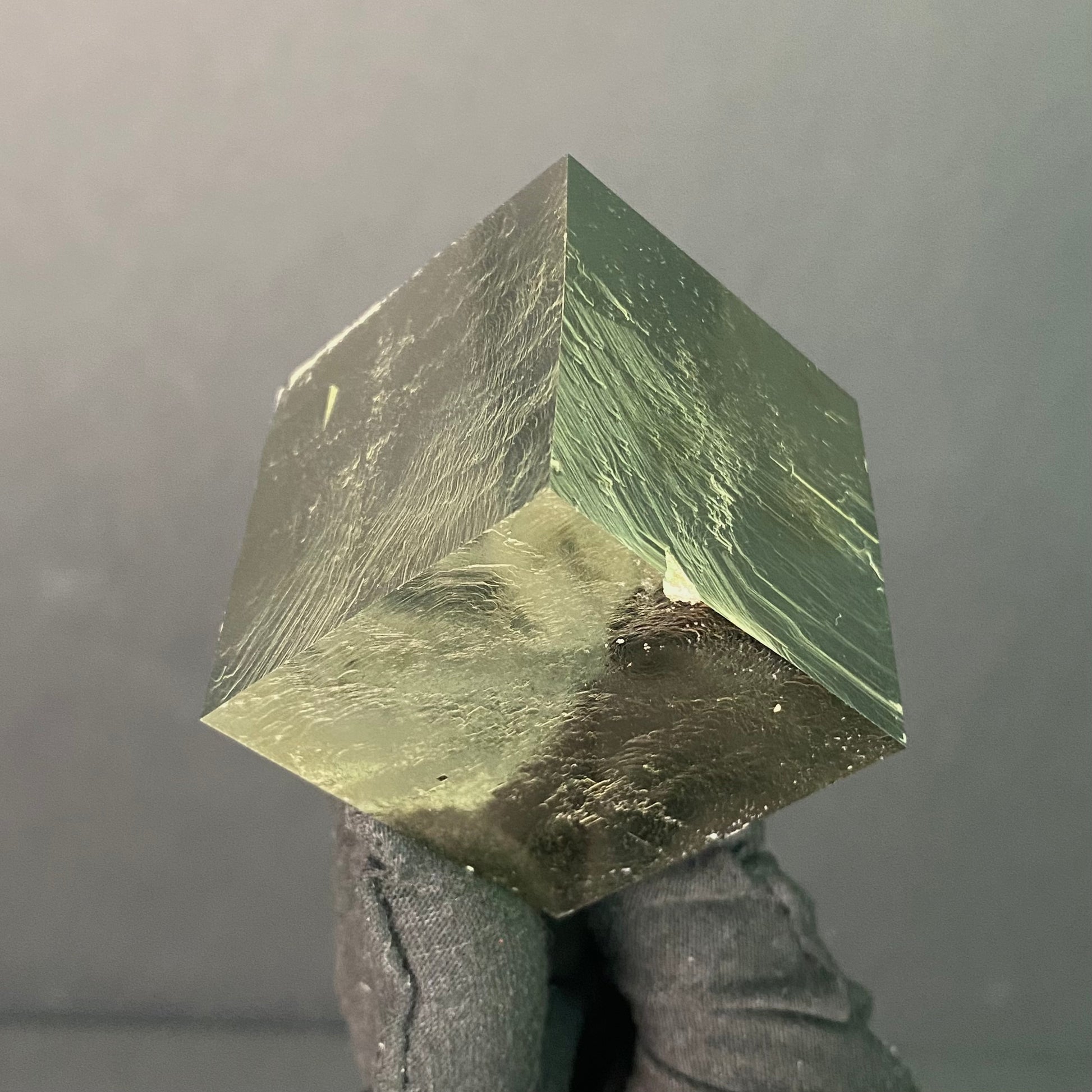 A high-quality sample of a single cube crystal from Pyrite Cubes, featuring well-defined terminations and perfect crystal faces with a metallic mirror luster.