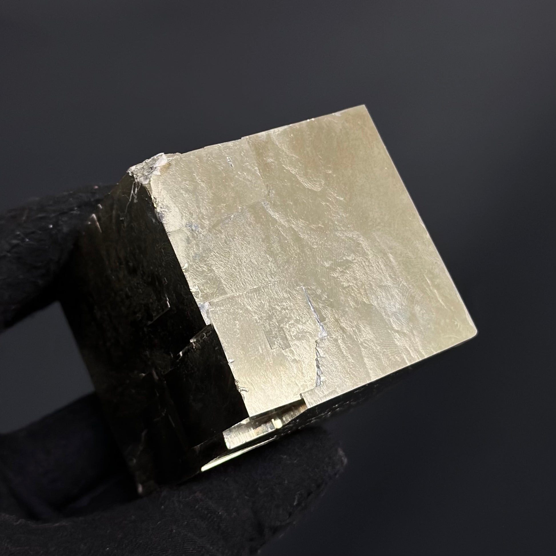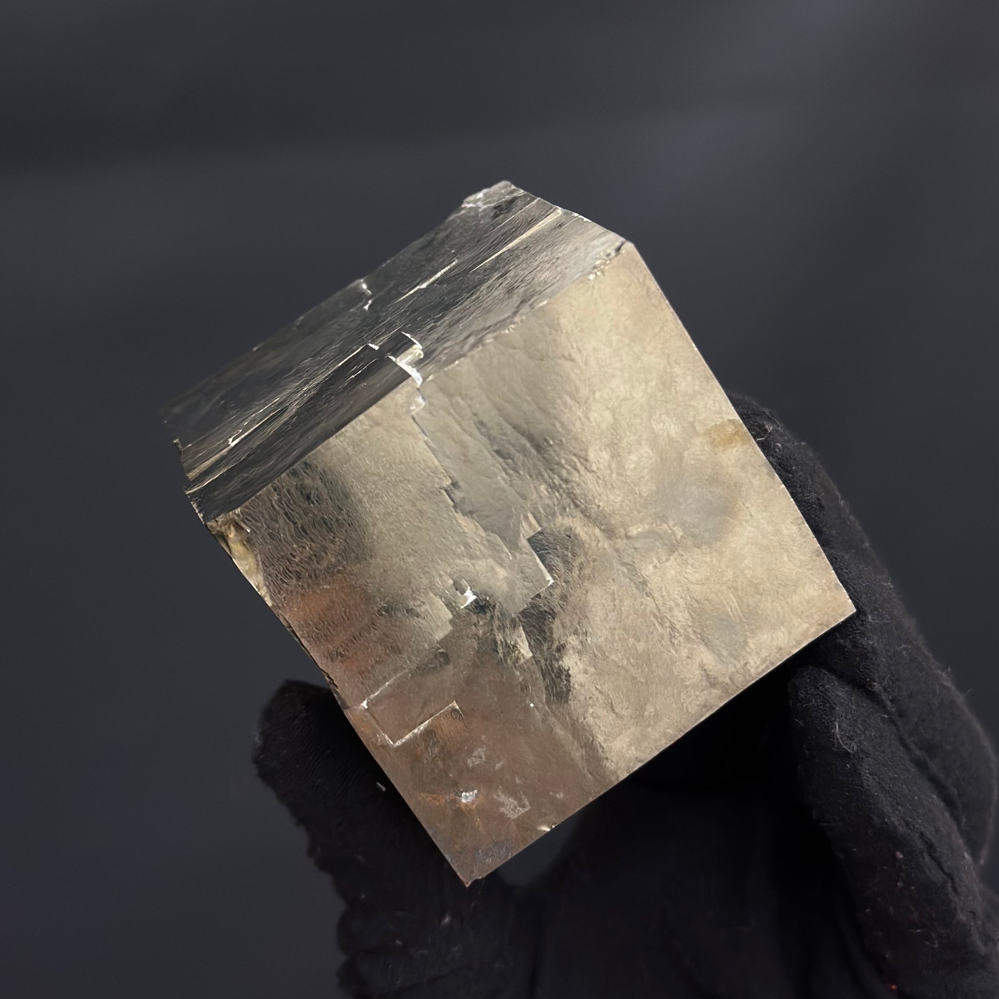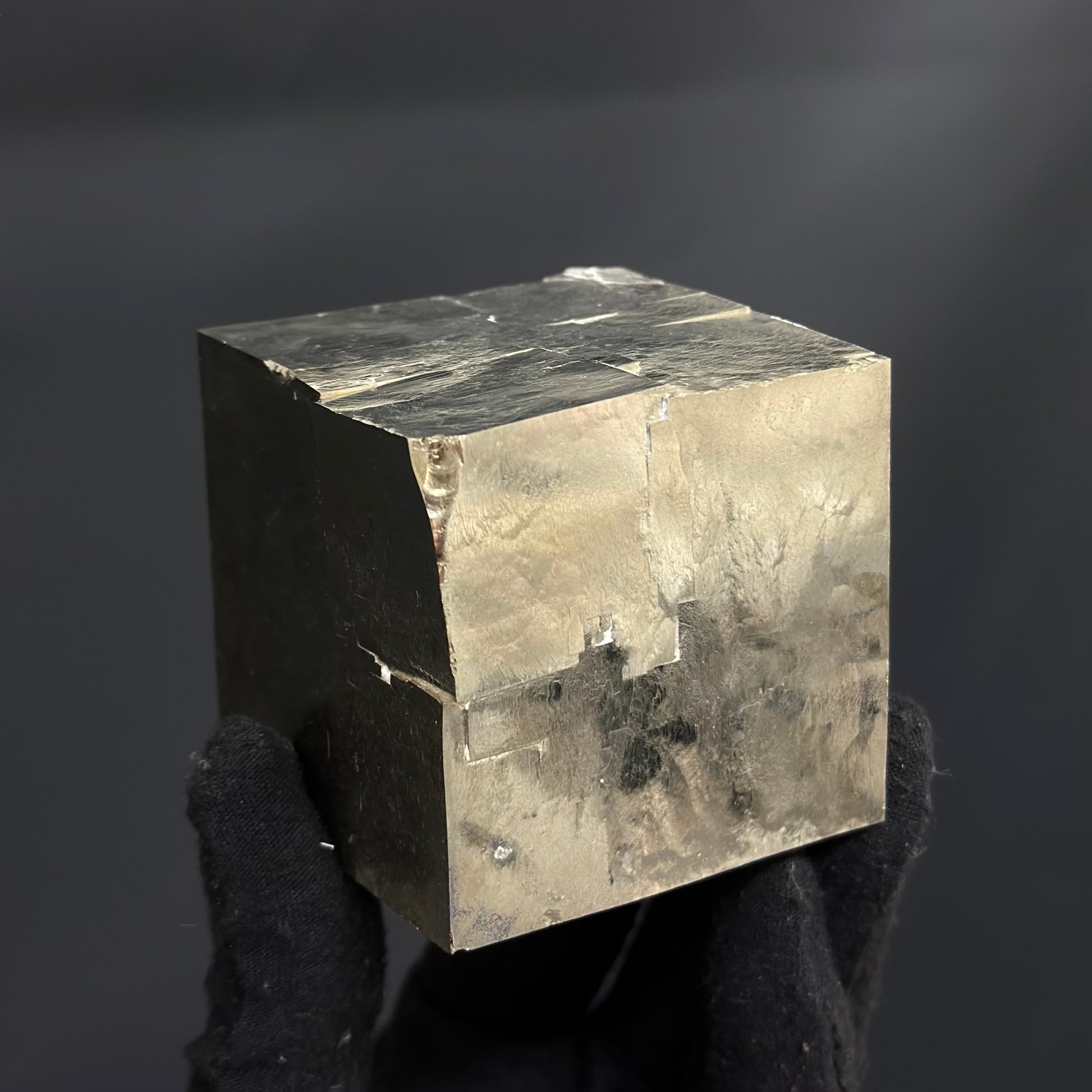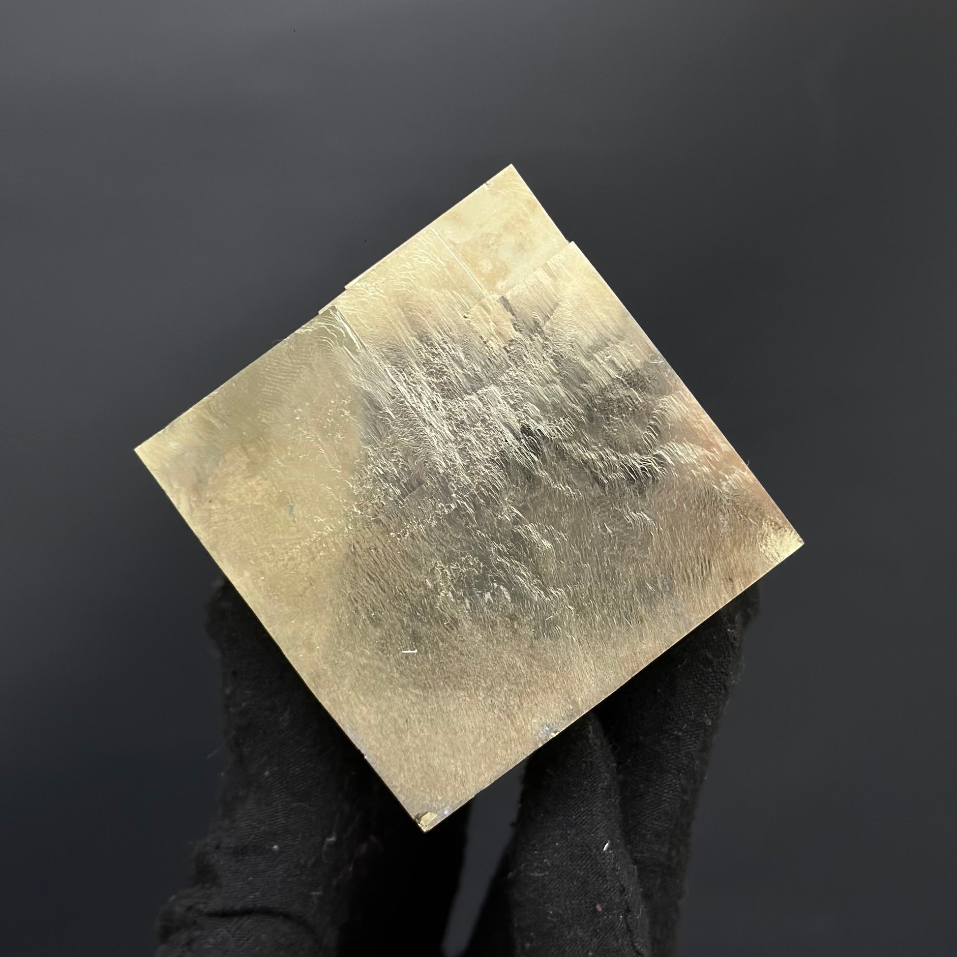 Large sample of a single cube crystal from Pyrite Cubes, featuring well-defined terminations and perfect crystal faces with a metallic mirror luster.