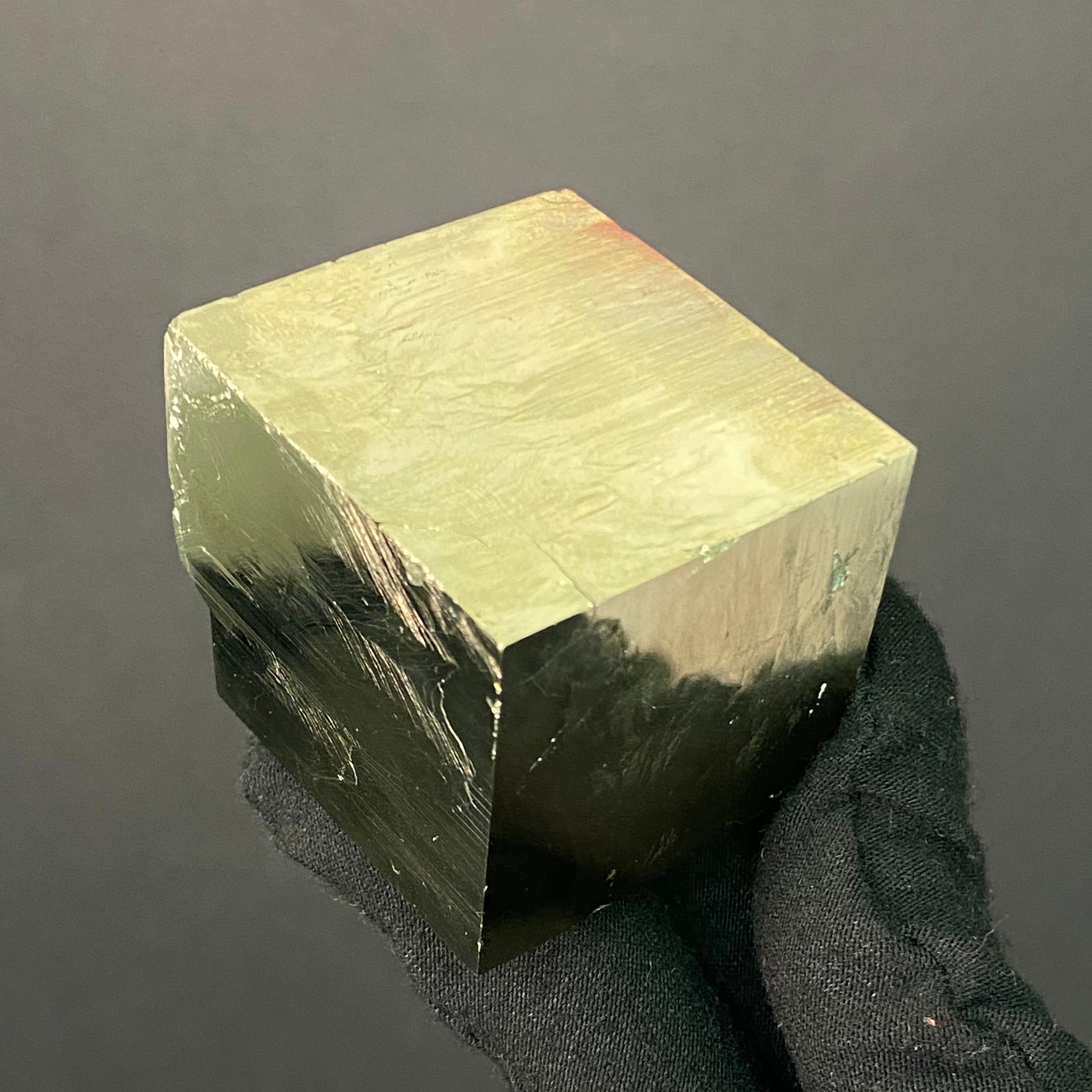A perfect example of Navajún Pyrite, the single cube, completely natural with an incredible golden mirror.